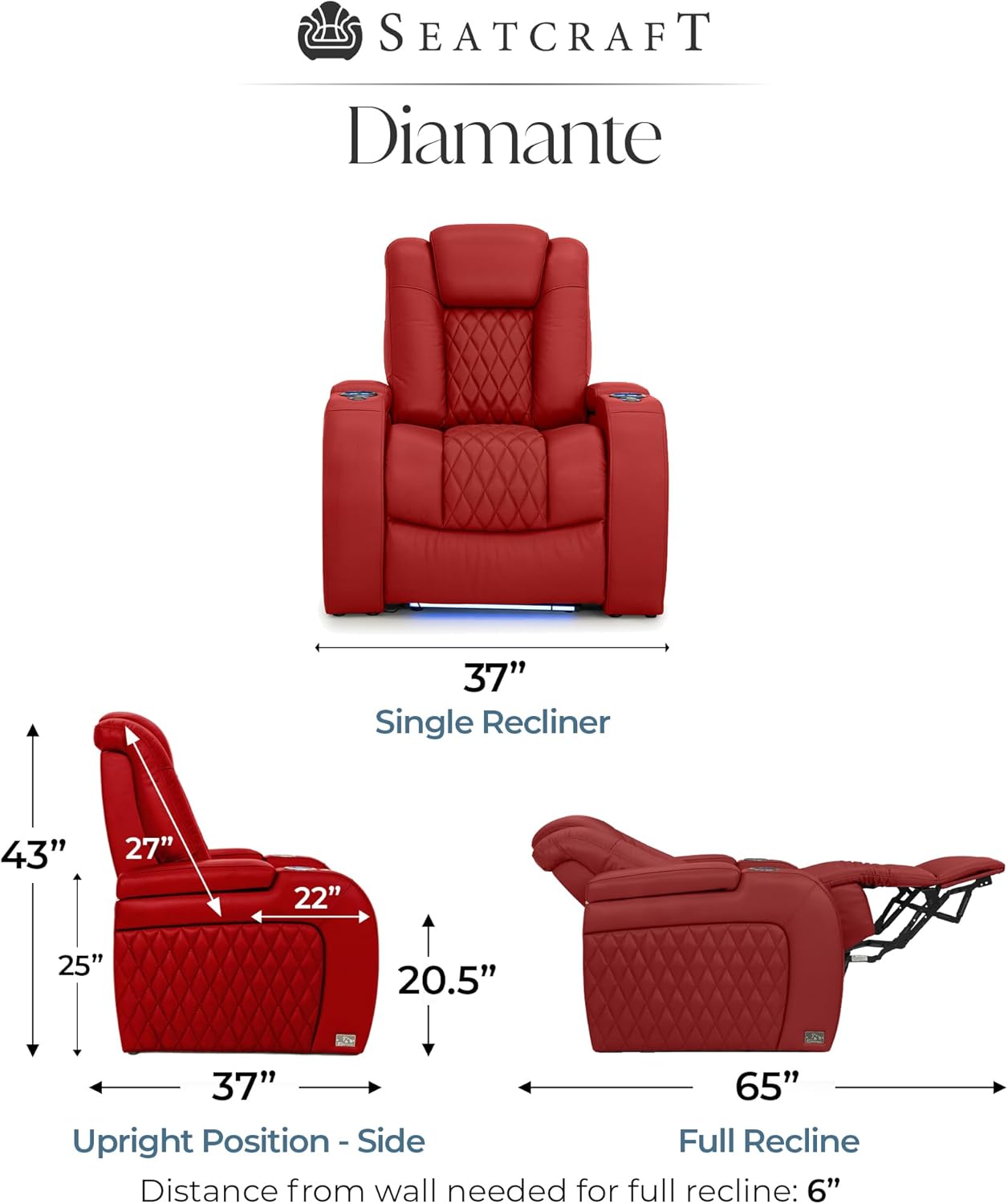 | Additional Features | Diamond Stitch Design, In-Arm Storage, Power Headrest, Recliner, USB Charging Ports |