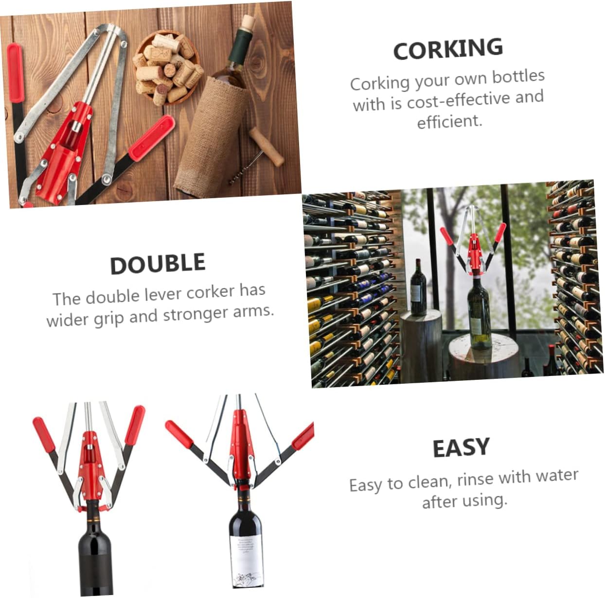 Package Include 1 x Hand Corker Features - Size: About 33.00X25.00X3.50cm/12.97X9.82X1.38in Corking Tool - Color: Red Handled Corker - Material: Iron and plastic Corker - Selected material, which is not easy to deform or break Household Corker. - Simply place the cork into the chamber, place the corker on of the bottle, and depress both levers Corker. - For results, have a bottle grip to help hold the bottle steady Iron Lever Corker. - As the name suggests, a lever is used to push the cork through a conical section that the cork, then into the bottle Wine Making Corker. - Fits all bottles and can use dry corks Bottle Corker.Goods InformationWine Bottle Corker Features the iron and plastic material, which has high durability, not easy to deform.Bottle Corker This corker is made of , which can withstand the use.Corking Tool Fine workmanship, it the practicality