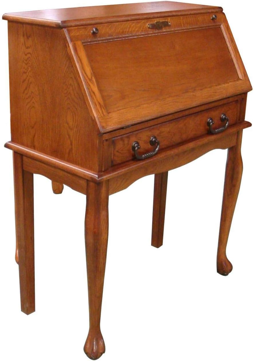 32" Solid Oak Secretary Drop Front Desk 32"W x 29"D x 41.5"H Slender solid oak cabriole legs letter slots and mini drawers behind drop front; center felt lined drawer with pencil tray Only 17" deep when closed; 28"deep when open; Two sturdy solid oak pull out slides to support drop down desk when open. Good Laptop desk. Burnished Walnut Oak Finish Easy assembly. Simply attach the four legs. Free Shipping
