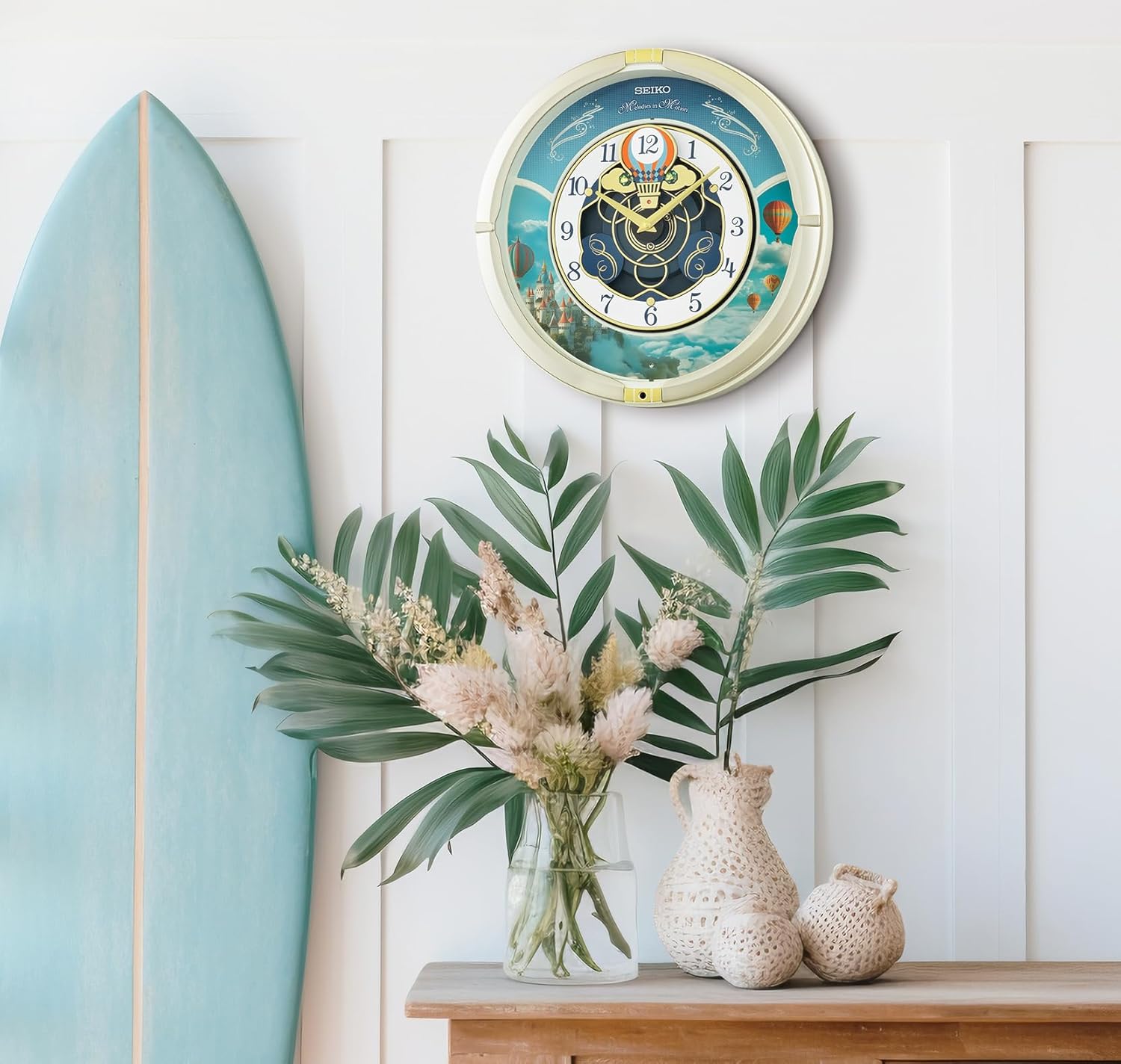 Let your imagination soar with the Seiko Blue Skies Melodies In Motion Clock—a breathtaking blend of elegance, artistry, and sound. Encased in an elegant ivory frame with gold accents, this enchanting clock features a captivating hot air balloon theme, drifting beneath a clear blue sky with a romantic castle in the background. Every hour, the magic unfolds as the hot air balloon travels gracefully around the clock face, accompanied by one of 40 finest-quality melodies—each with delightful opening and closing sequences. Three sparkling crystals adorn the balloon, catching the light as it moves, adding just the right touch of sparkle. Designed for beauty and built for reliability, this clock includes: light sensor that automatically silences music and motion in, the dark, demonstration button to relive the magic anytime, volume control for personalized sound levels, crystal glass for clarity and elegance, quartz movement for precision timekeeping, and powered by four C batteries (included)—no cords, no hassle. With dimensions of 17 x 16 x 4 inches, the Blue Skies Clock is the perfect fit for any room. Whether for a tween’s whimsical dreamscape or an adult’s elegant escape, it transforms any wall into a scene of charm and serenity. Make every hour an adventure with the Seiko Blue Skies Melodies In Motion Clock—where timeless beauty, melody, and motion take flight.