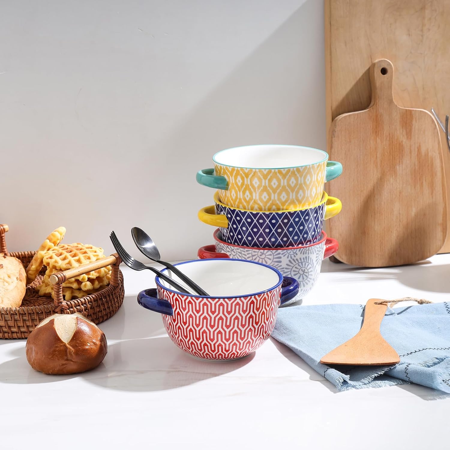 Selamica Ceramic Creme Brulee Ramekins 4 Oz + French Onion Soup Bowls 20 Oz, Oven Safe, Assorted Colors
