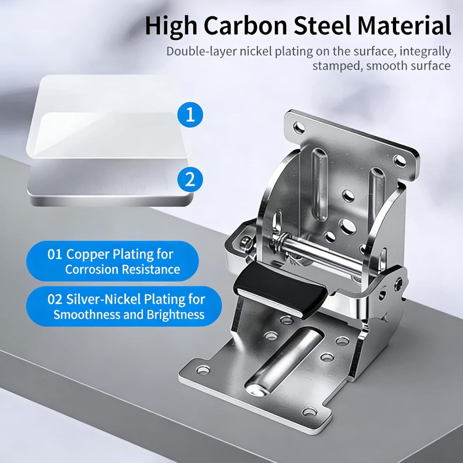 Upgrade your furniture and workspace with these Self-Locking Folding Hinges, featuring a 180-degree wide-angle design and a convenient press-switch mechanism. Each hinge is crafted from heavy-duty thickened steel with a sleek finish, delivering outstanding load-bearing capacity and long-lasting durability. The built-in double-spring self-locking system automatically locks the hinge securely at 90 degrees when open, and a simple press of the switch releases it to fold flat — saving valuable space when not in use. These versatile hinges can be installed at both 90° and 180° positions, making them ideal for folding tables, desks, workbenches, cabinets, and more. Pre-drilled mounting holes ensure quick and straightforward installation. This pack includes 4 hinges, providing everything you need for a complete DIY project. Whether you're building a fold-down wall desk or upgrading a workbench, these heavy-duty hinges offer reliable support and a professional finish for any home or workshop application.