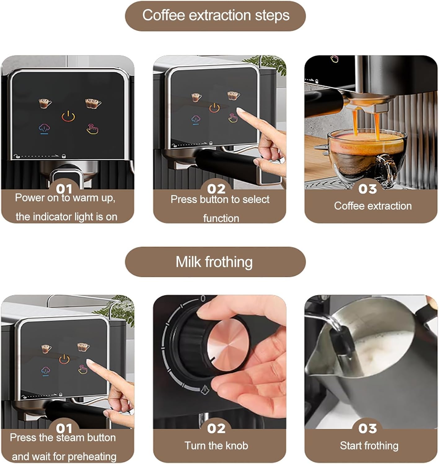 Removable Water Catch Tray: > The coffee maker is equipped with a removable catch tray, which makes it easy for users to clean up the coffee liquid and stains. This makes daily maintenance easy and , no need to worry about the cleaning hassle caused by coffee liquid overflow. > Independent Steam Knob: > The coffee maker features an independent steam knob that allows users to adjust the steam size at will. This function is very practical for making milk froth and other coffee drinks that require steam, and can meet the needs of different users on the amount of steam. > Top Cup Warming Area: > The top cup warming zone is a thoughtful that allows users to preheat the cup in advance to lock in the strong flavor of the coffee. Preheating the cup helps to maintain the temperature and flavor of the coffee, enhancing the drinking experience. > > Product Name: Coffee Maker > Coffee machine principle: pump pressure > Body Material: Plastic > Coffee machine type: semi-automatic espresso > Water tank capacity: 1.5L (including) > Coffee maker classification: steam type > Package content: coffee machine * 1 > > Attention: > Due to manual measurement, there may be errors, please prevail in kind! > Due to different light and screen, the product color may be slightly different from the .{/p}