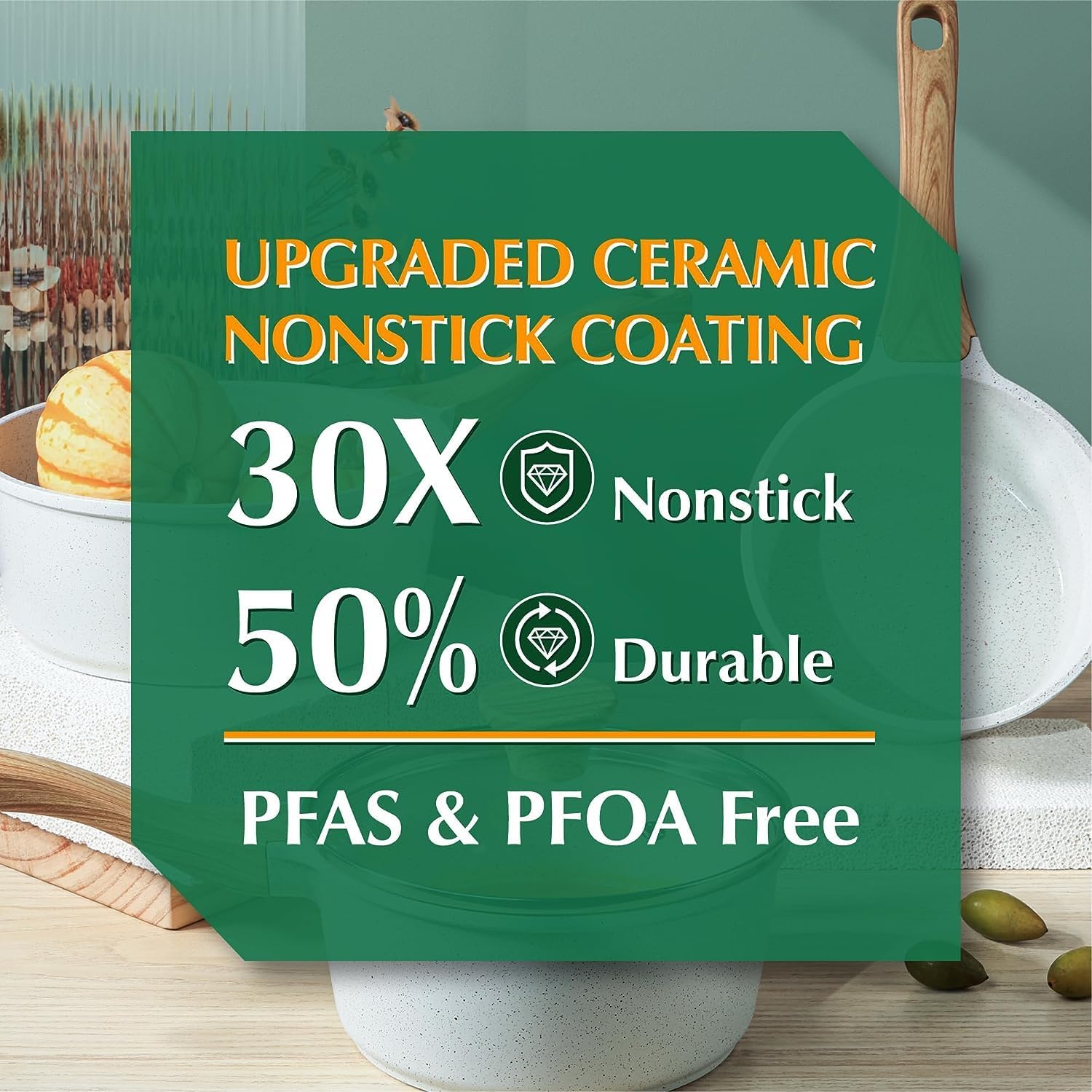 Covered with a healthy coating, SENSARTE ceramic non-stick pots and pans with lid offer a healthier cooking experience and perfect capacity. The rivet-free design of the cookware handles not only makes cooking and cleaning effortless but also provides comfortable grips. The sturdy structure and advanced bottom coating technology enhance cooking performance and versatility, making this large stock pot with lid an ideal choice for efficient, high-quality cooking. The matching explosion-proof tempered glass lid provides maximum visibility and prevents food splashing.
