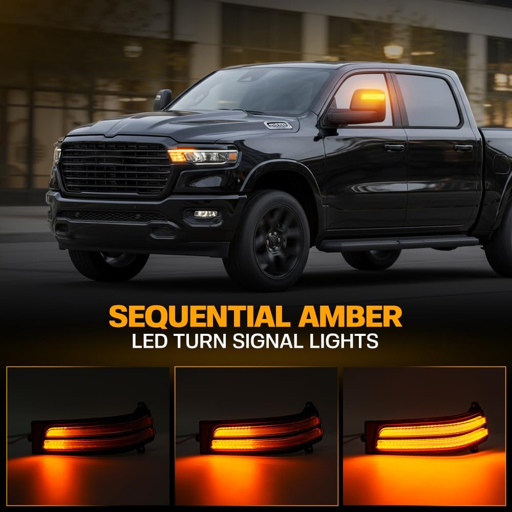 One Pair Full LED Dynamic Side Mirror Turn Signal Light for 2025-2026 Do'dge Ram 1500, 2023-2026 Ram 2500 3500 Specifications: 1. Lens Color: Amoked lens 2. Lens Material: ABS+PC plastic 3. Light Color: Amber turn signal light + White running light + White spot light 4. Waterproof: Ip67 5. Lifespan: 50,000 hrs Features: Switchback sequential amber turn signals combined with bright white running and spot lights enhance visibility and make your Ram truck stand out High-quality with DOT/SAE/CE/E4 approved, durable housing with an anti-scratch lens Easy installation, plug and play, no modification This innovative led dynamic sequential design create a striking effect on side mirror marker light so that you can see a blinking indicator light light on the mirror from the drivers&passengers seat Fitment: Note: Only fit towing mirrors with spot light! 2025-2026 Do'dge Ram 1500 2023-2026 Do'dge Ram 2500 3500 Replace OEM Part Number: 68620524AB, 68620525AB, 68620526AB, 68620527AB Package: 2 x Led Side Mirror Marker Lights for 2023-2026 Ram 2500/3500 Get this new mirror lights which can give your trucks a trendy performance and dynamic LED turn signal light with enhanced safety & visibility at night!