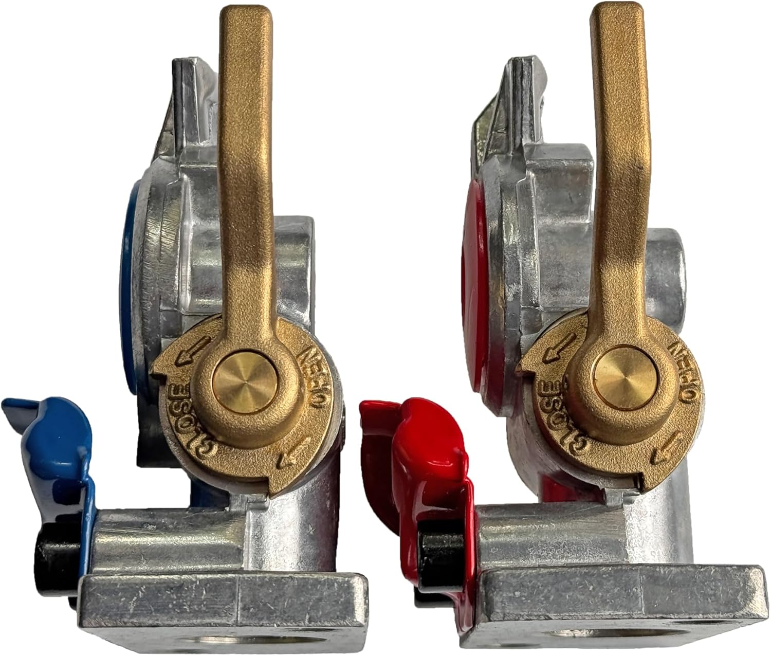 One pair of aluminum alloy service and emergency shut off gladhands. Integrated brass shut off valve seals the air system. Ideal for tandem and double trailers. Aluminum body for increased protection against corrosive environments and chemicals. Gladhands are both stamped and color coded red and blue for ease of identification. Includes replaceable polyurethane seals and fine mesh screen inserts to increase seal longevity and prevent foreign material from entering the air brake system. 3/8” threaded FPT port on base of gladhands. Meets or exceeds SAE J318 requirements. Approximate dimensions ea = 4 1/2” x 3 1/4” x 2 1/2” Approximate net weight pair = 2lbs 2oz