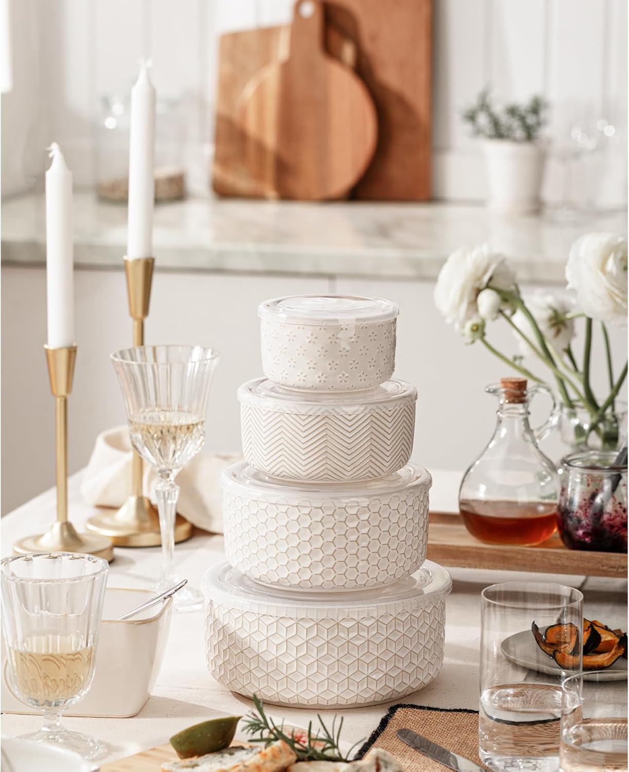 Mikigey Serving Bowls with Lids, Ceramic Embossed Nesting Mixing Bowls