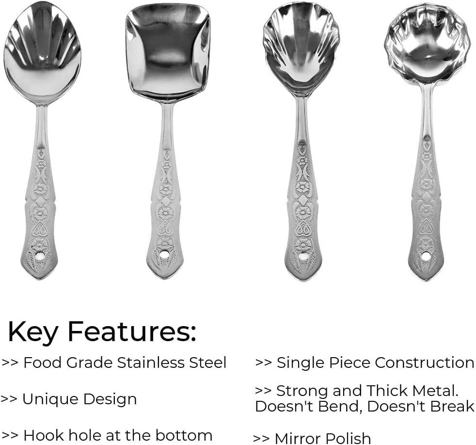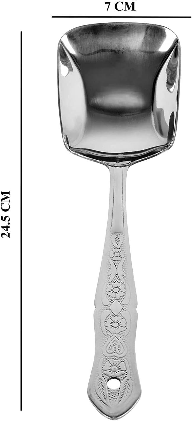 This Serving Spoon Set for Dining Table fancy contains 1 Ladle (Karachi), 2 Solid Spoon (Chamcha), and 1 Rice Spoon for Serving. It is a very Good Quality Karchi total Set of 4 pcs.This Chamcha Set is an Easy to Clean and Beautiful Design for everyday use. This Steel Spatula set has Smooth edges for safety while serving.