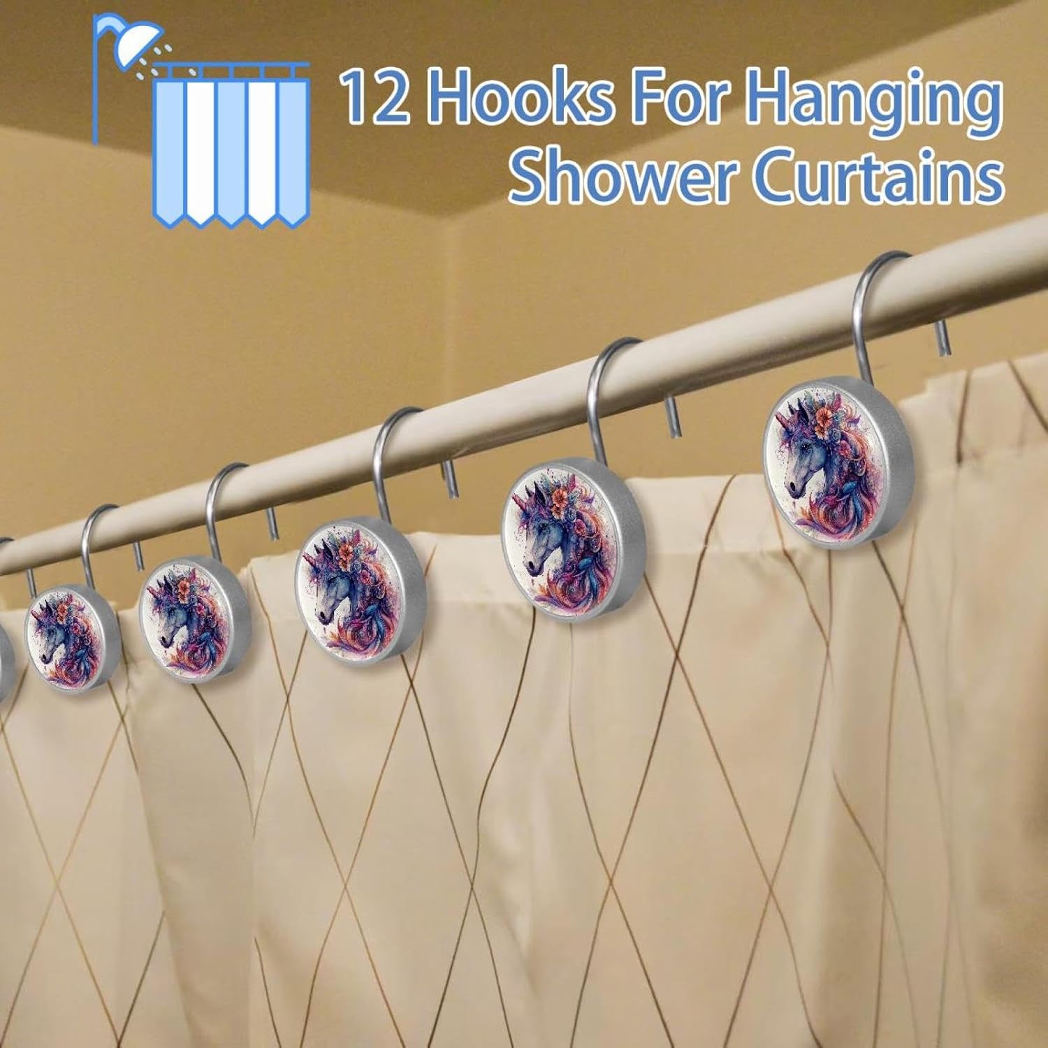 MATERIAL: glass, stainless steel. These shower curtain hooks can be decoration bathroom and will be long-lasting.12 pieces of shower curtain hooks, round crystal glass decoration, printed patterns, silver hooks to match various styles of bathroom shower curtains. SIZE: Crystal glass diameter of round shower curtain hook is 1.45x1.45in/ 3.7x3.7cm. The shower curtain hooks diameter is about 1.1in, 12 pieces shower curtain hooks are suitable for rod of 8-28mm(0.3"-1.1"). RUST RESISTANT:Shower hooks are made of stainless steel and crystal glass, which is durable, rust-proof and corrosion-resistant, it will not rust suitable for wet bathroom environment. EASY TO INSTALL:Hand the shower curtain hooks hold securely on straight or curved shower curtain rods,slid easily and smoothly. Easy to install and decorate your bathroom. BEAUTIFUL AND ELEGANT:Beautiful Love hook add charming scenery for your bathroom, baby room, bedroom, living room, and the gorgeous style is easy to match with any kinds of bathroom shower curtain. EASY GLIDE: Open and close your shower curtain quickly and easily with the Shower Hooks, easily glides on shower curtain rods and tension rods. No snagging; no effort; no hassle PACKAGE: 12 shower curtain hooks in a pack.The bathroom curtain hook has a smooth appearance and can be hung on the pole to pull it at will. Special price 12 sets to meet your needs.