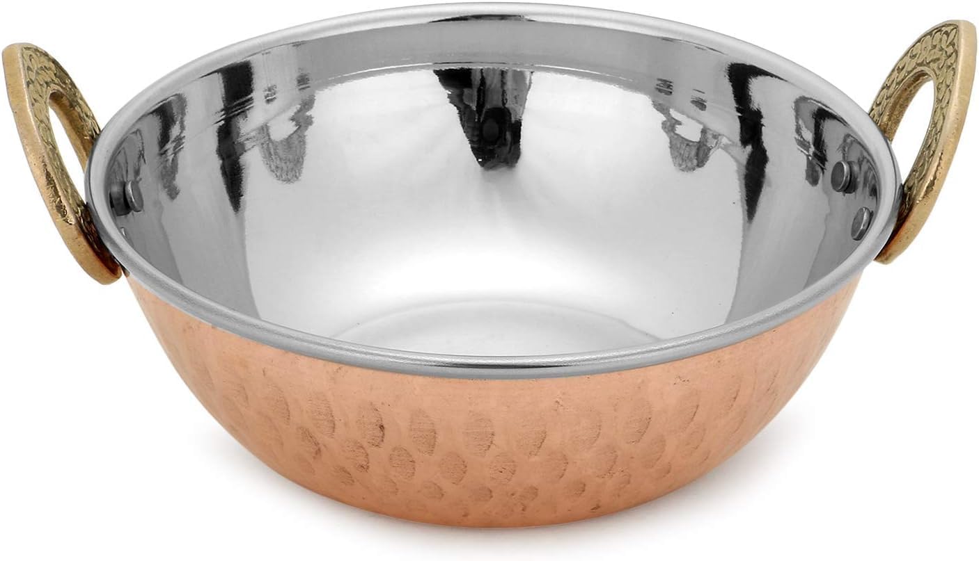 This is a set of 4 open vegetable serving pans called Karahi in India. Bring the curry restaurant experience into your home with these hammered karahi (serving pans) with handles. They are made of high quality stainless steel with an outer layer of copper, making it resistant to heat and corrosion. These karahis are traditional tableware to serve Indian dishes, both dry kind like the biryanis fried vegetables or meat, as well as curry items like chicken curry or daal. Be aware that these karahis have two layers of metal, which enable them to preserve heat for longer duration. Therefore these karahis should be used only as centerpiece serve ware tableware. They should never be used as a cookware. The copper layer will keep the curry warm on the dining table. Double layer of metals with air cushion minimises heat radiation. With these copper serving utensils, you will be able to give your guests the most authentic feel of traditional Indian dining. The hammering by hand on the copper metal makes it look beautiful. Use this karahi pan along with other copper tableware items to get an authentic Indian dining experience.