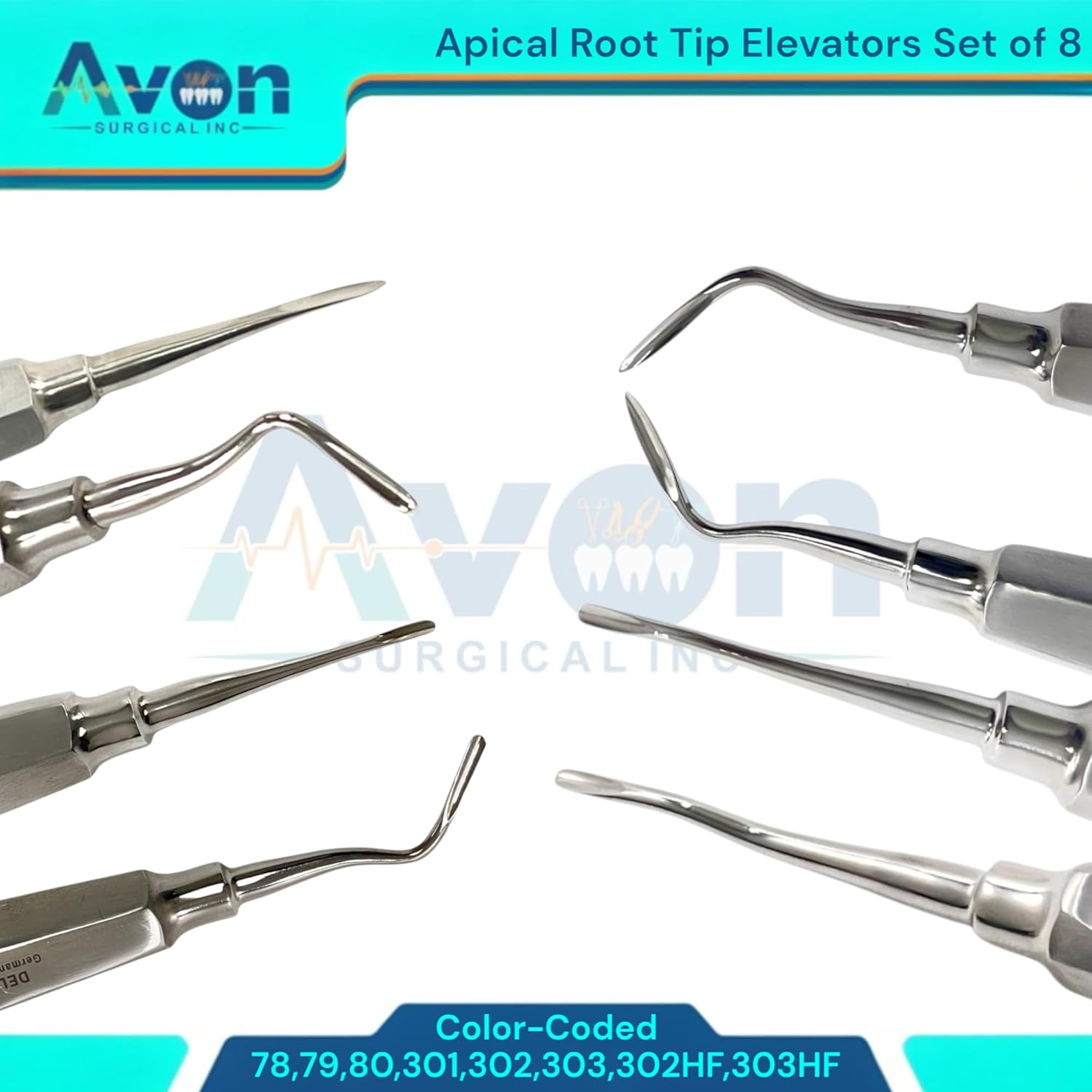 Includes: Set of 8 apical root tip pick dental tooth extraction elevators, color-coded hollow handle - German stainless steel. #78, #79, #80, #301, #302, #303, #302HF, #303HF. Varying Tip Design: Each elevator features a distinct tip design (straight, angled, slight offset, gouge, sharp). Essential for various root tip extraction needs. Color-Coded Handle: Facilitates quick and easy identification, streamlining workflow and improving efficiency. German Stainless Steel: Crafted from German Stainless Steel, ensuring exceptional durability, corrosion resistance, and longevity. Ergonomic Hollow Handle: The hollow handle design reduces instrument weight, minimizing hand fatigue during prolonged procedures. The ergonomic shape provides a comfortable and secure grip, enhancing control and precision.
