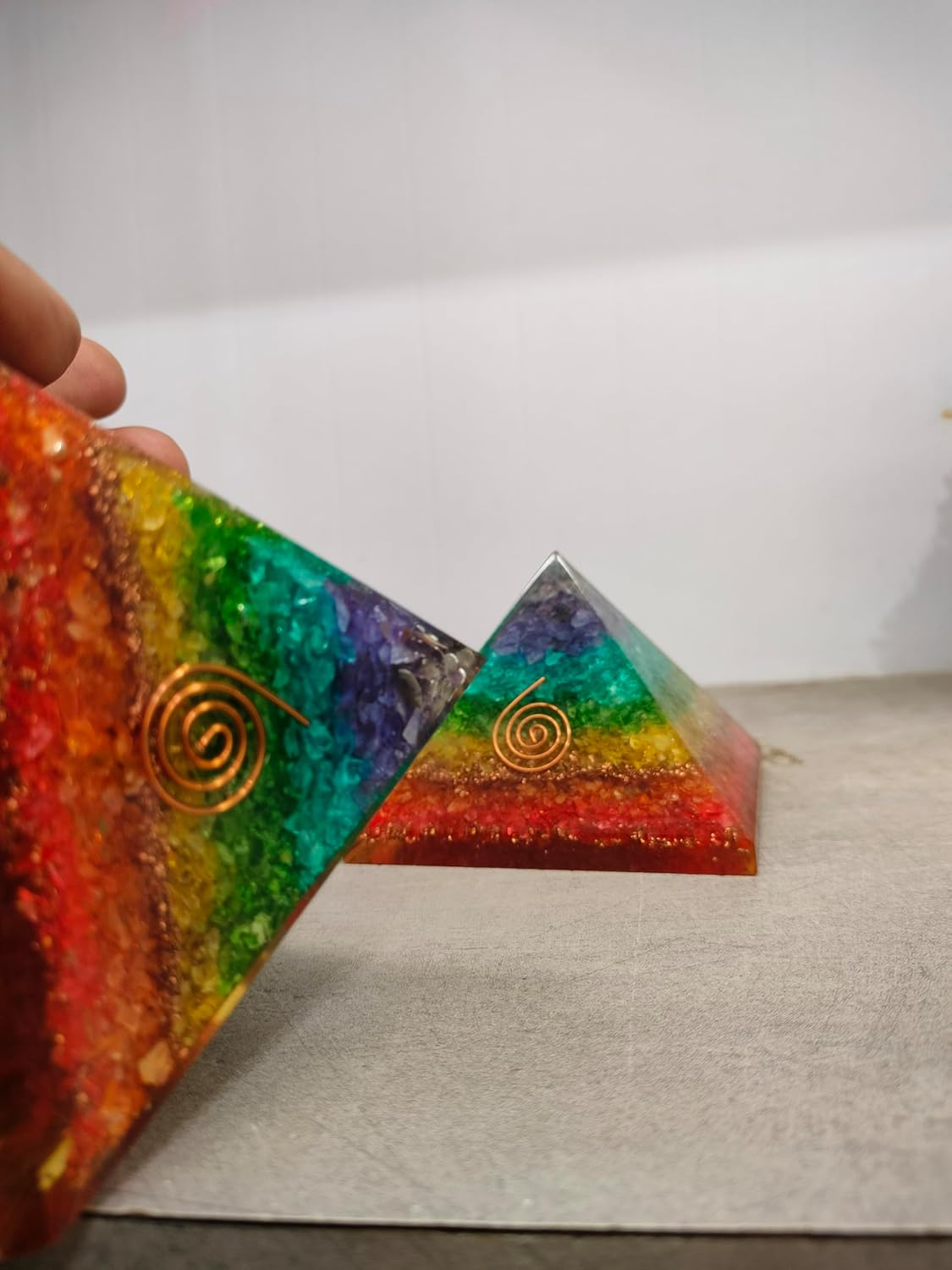 ๐ Seven Chakra Rainbow Orgone Pyramid โ Spiritual Healing, Energy Protection & Meditation Tool ๐ This handcrafted Seven Chakra Orgone Pyramid is designed to align your chakras, cleanse negativity, and boost spiritual energy. Made with genuine healing crystals, it enhances meditation, Reiki, and yoga practices while shielding from EMF radiation and negative influences. Whether placed at home, office, or a sacred space, this pyramid serves as a powerful tool for manifestation, energy healing, and aura cleansing. ๐ฎ Key Features & Benefits: ๐ Seven Chakra Alignment for Holistic Healing โ Balances physical, emotional & spiritual energy flow. โก Orgone Energy Converter for Positive Vibrations โ Transforms low-frequency energy into high-frequency positivity. ๐ฎ Genuine Crystal Infusion for Chakra Activation โ Contains Amethyst, Lapis Lazuli, Green Aventurine, Yellow Jasper, Carnelian & Red Jasper.