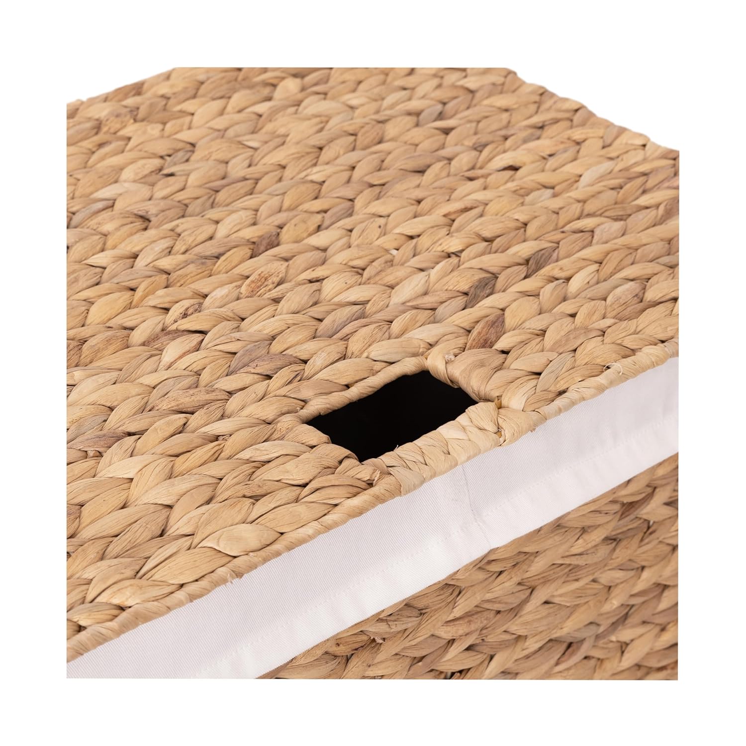 Upscale your laundry routine with the Seville Classics sustainable handwoven water hyacinth laundry hamper on wheels. Designed for both style and functionality, this lidded hamper features a unique and natural handwoven water hyacinth over a sturdy metal frame. This mobile hamper measures 23” W x 15” D x 23” H. The 2” gold sphere casters allow for effortless mobility to and from the laundry room. The removable machine washable liner bag (100% polyester) features a two-compartment design for easy sorting.