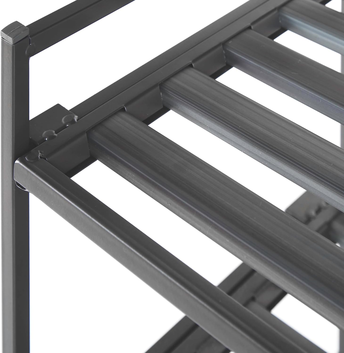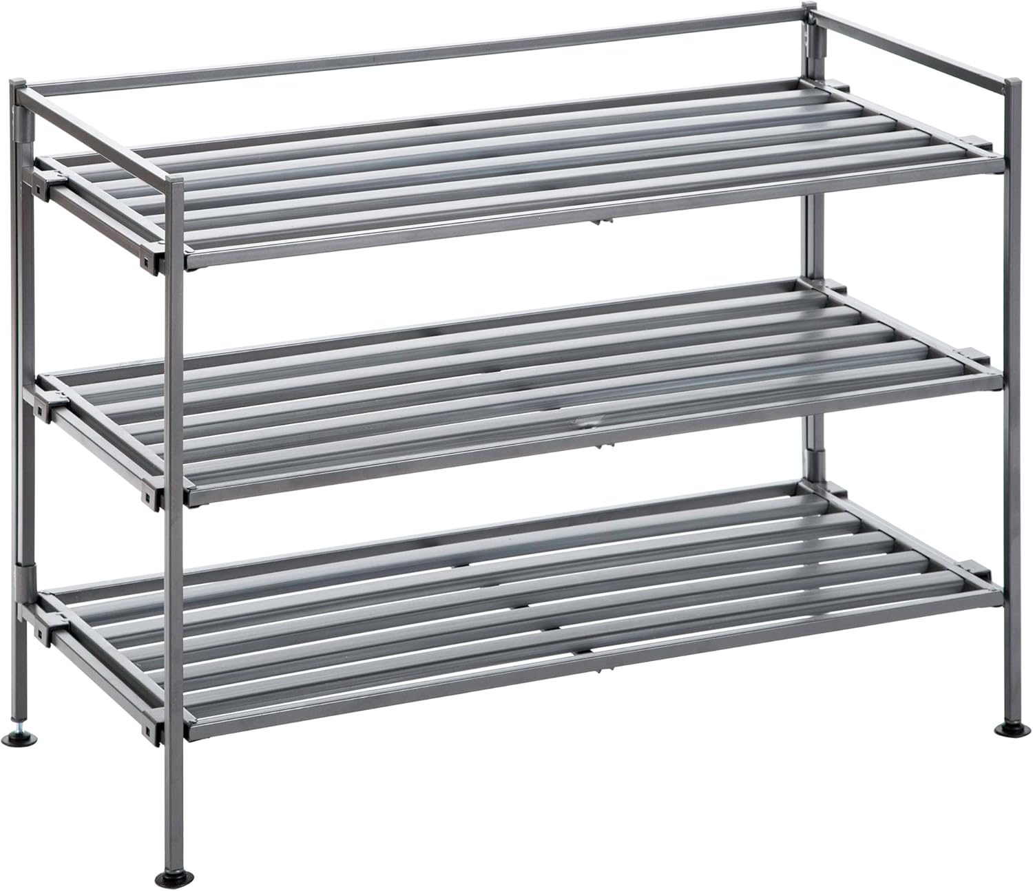 Organize your space with the Seville Classics 3-Tier Resin Slatted Shoe Rack. The modern design is ideal for any room in your home from the bedroom, living room, kitchen, closet, garage, pantry, home office, and door entryway. Sort and store all sizes of sneakers, boots, sandals or heels. The patented design accommodates up to 3 shoes per shelf and 3 low-profile shoes under the rack. Our innovative Interlock® design allows you to connect multiple units horizontally for a customizable modular storage system. The steel frame design will support your storage needs with a weight capacity of 90 lbs. total (30 lbs. per shelf).