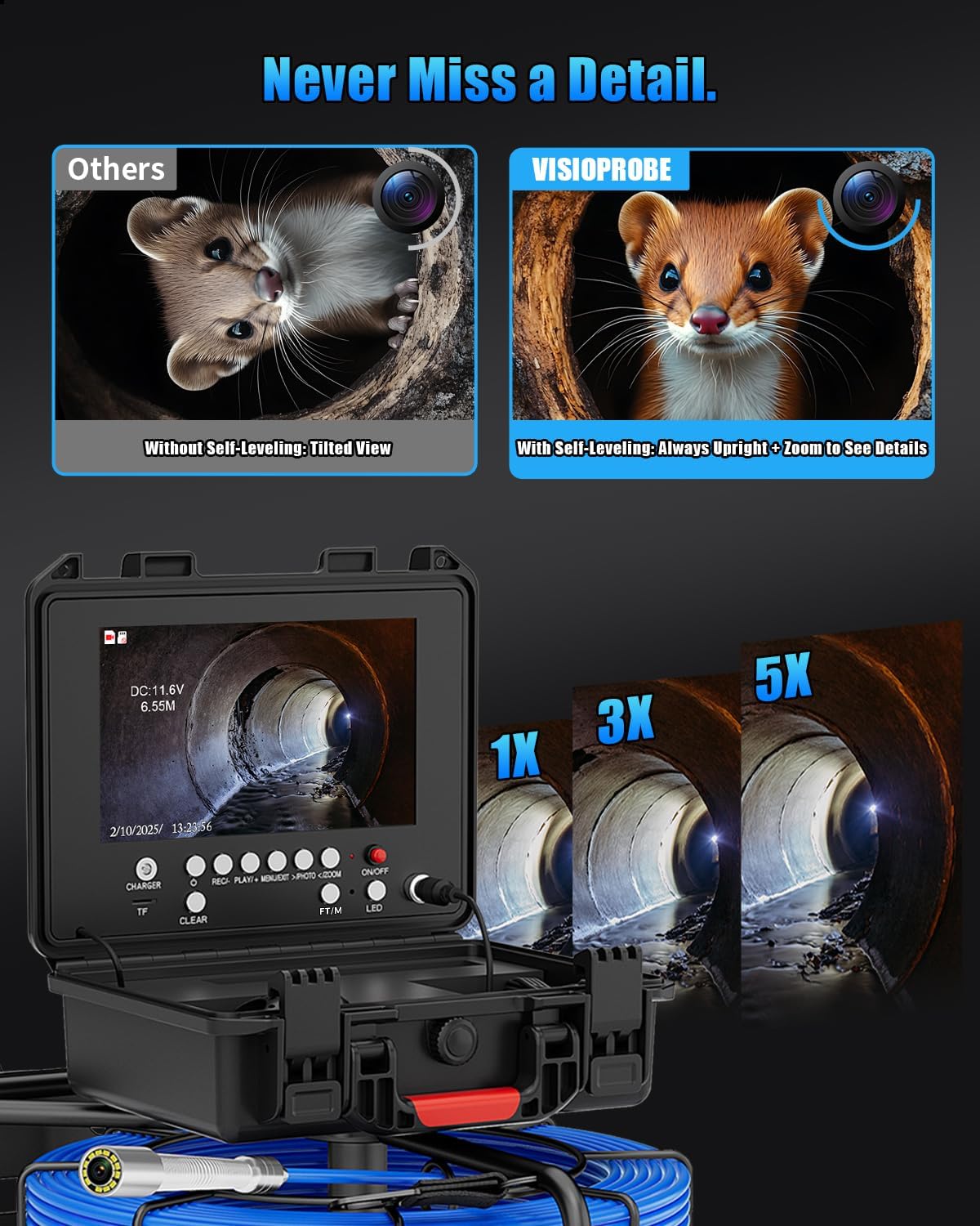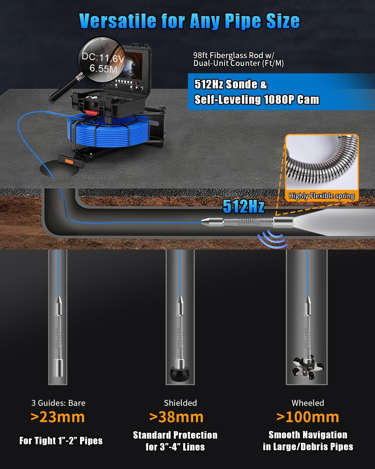 | Model Name | Self-Leveling Sewer Camera 9" with 164ft 7mm Cable, 512Hz Transmitter & 23mm Probe with Meter Counter, 32GB Card, IP68 Portable Endoscope Camera with Light for Drain Sewer Pipeline(Without Locator) |