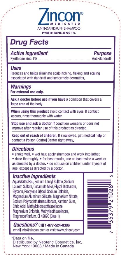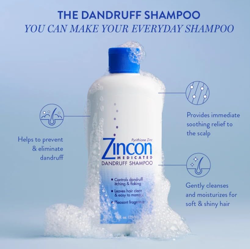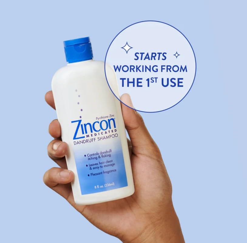 Zincon Medicated Dandruff Shampoo is formulated with 1% Pyrithione Zinc to help control dandruff and flaking while cleansing the scalp. This gentle shampoo can be used regularly to help reduce visible flakes, scalp itching, and irritation associated with dandruff. With a clean, refreshing scent, it leaves hair feeling soft, manageable, and healthy-looking. Suitable for most hair types and color-treated hair, this formula offers daily care and scalp comfort with consistent use. NDC:62673-017-98; UPC: 735379210285