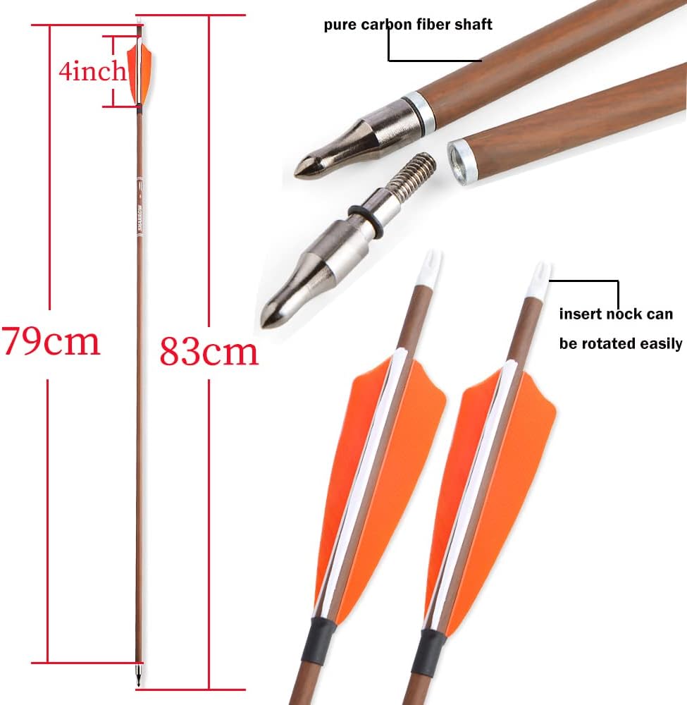Specifications: Carbon Arrows Wood Grain with Removable Tips 100 grain Material: Pure Carbon Spine: 340/400/500/600 Full Arrow Length: 32.67"/83cm Arrow Shaft Length:31"/79cm Shaft ID: 6.2mm Shaft OD: 7.5mm(Spine 340) 7.2mm(Spine 400) 7.1mm(Spine 500) 7.0mm(Spine 600) Arrow Nock: Insert style adjustable arrow nocks Arrow Tip: 100 grain removable screw-in arrowheads Weight: 24.2g(Spine 340) 21.7g(Spine 400) 21.6g(Spine 500) 18.8g(Spine 600) (Has measurement errors, no guarantee that the weight of each arrow is exactly the same. ) Package Quantity: 6/12 pieces Carbon Arrows Wood Grain Note: 1.Do not shoot to hard objects (such as stone or concrete wall). This may damage your arrows and cause shattering or cracking. 2.Check the status of arrows before shooting. If you find cracks on one arrow shaft, please change another arrow for safety reasons. 3.Please use a proper bow within recommended draw weight range. Using a bow with too high draw weight may cause damage both to your bow and arrows. 4.This is not a toy. Do not shoot to people. Warm Note: The arrow feathers are the natural original Turkey Feathers, adding to the long distance transportation, the feathers may be squeezed during transportation, which will cause the feathers to deform. As to this situation, please don't worry, steam produced by boiling water can be sued to make feathers recover the original shape quickly. Thanks for your understanding.