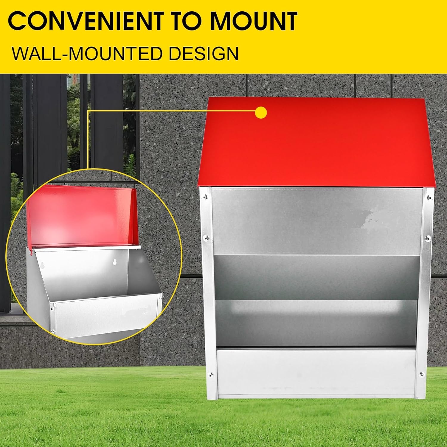 Provide a steady supply of feed for your chickens, quails, ducks, and more poultry with the Shengyi Chicken Feeder Rainproof Outdoor Weatherproof Chicken Feeder . No need to worry about this feeder rusting and crumbling after extended outdoor use because it is constructed of galvanized steel that is water-resistant. The chicken food feeder is designed to prevent your poultry from tossing seed out, and it includes an attachable awning (some assembly required, screws included). It includes a lid to allow for easy refilling and cleaning. The feeder has pre-drilled holes on the back panel for optional mounting to your coop, but mounting supplies for covered chicken feeders are not included.