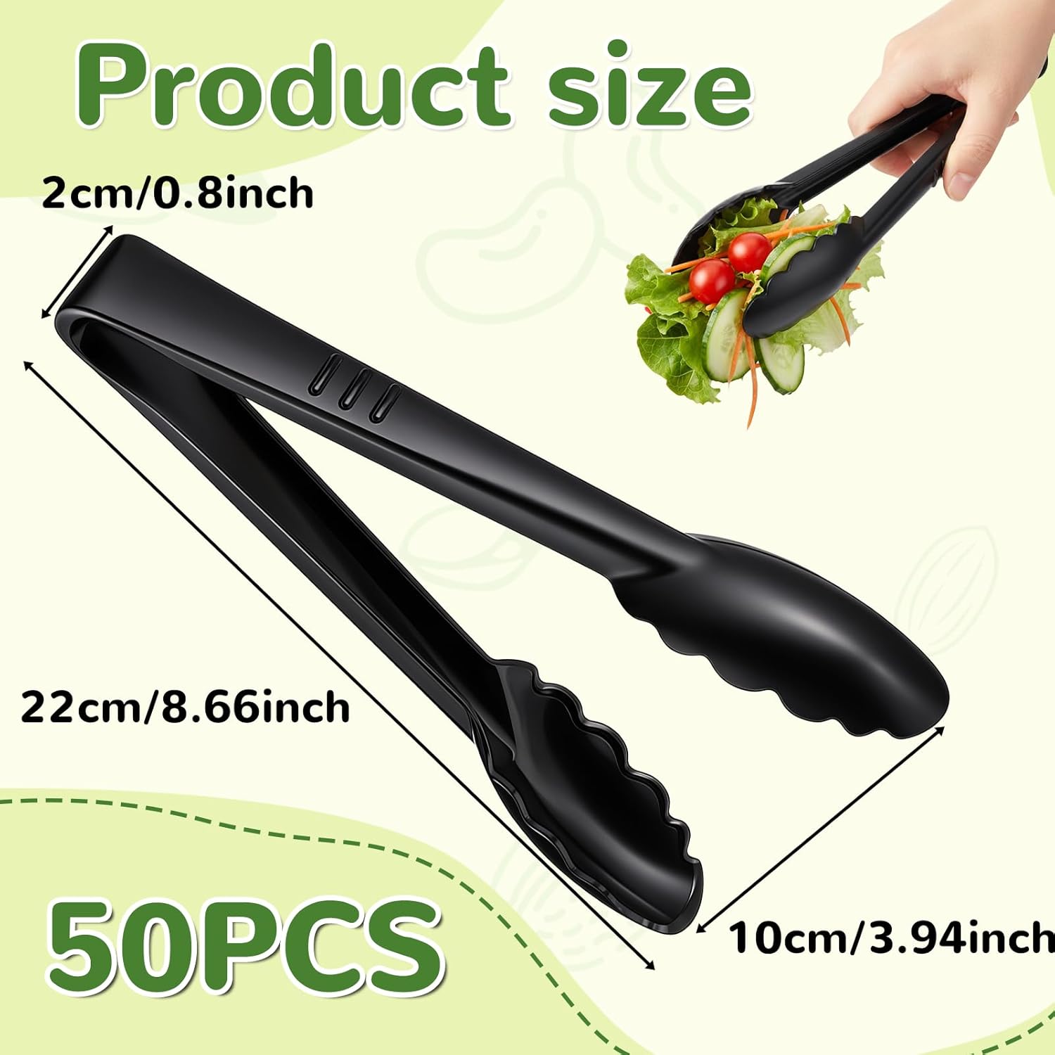 Package Contents: 50 pcs black 9" Plastic Tongs for ServingProduct Name: Plastic Serving TongsMaterial: PPColor: BlackWeight (g): 1308Dimensions (cm): Length: 22cm/8.66inches, Widest Opening: 10cm/3.94inches