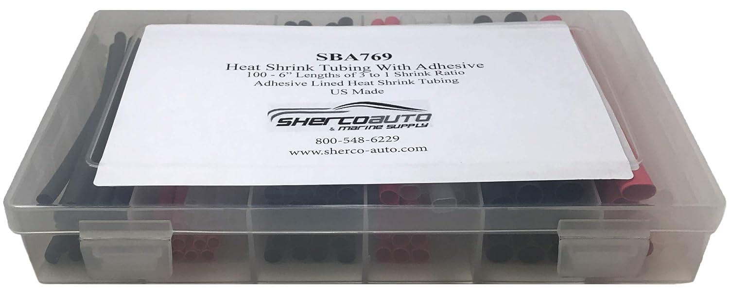 Flexible adhesive-lined hst200 series heat shrink tubing. shrink ratio: 3 to 1 a flame-retardant tubing (except clear) with an internal layer of thermo-plastic adhesive which provides a barrier against contaminants. Still highly flexible for conforming to irregular shapes. * environmental protection forponents * protection of automobile, marine and truck wire splices and harness breakouts * adhesive-lining provides a seal against corrosion. contains: 22-20 gauge, 3/16 in; black 20 pcs 22-20 gauge, 3/16 in; red 10 pcs 22-20 gauge, 3/16 in; clear 10 pcs 18-14 gauge, 1/4 in; black 20 pcs 18-14 gauge, 1/4 in; red 10 pcs 8-14 gauge, 1/4 in; clear 10 pcs 12-6 gauge, 3/8 in; black 10 pcs 12-6 gauge, 3/8 in; red 5 pcs 12-6 gauge, 3/8 in; clear 5 pcs