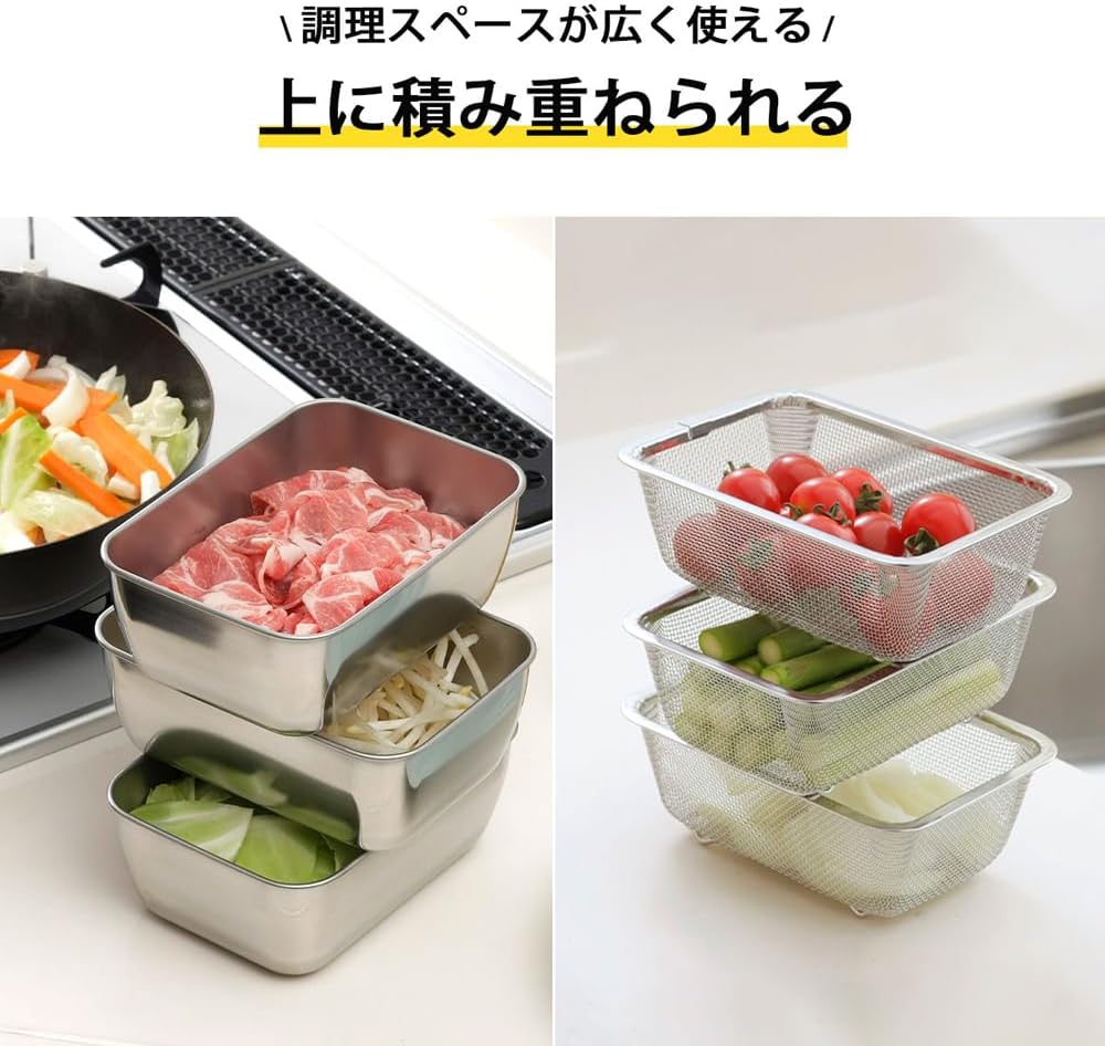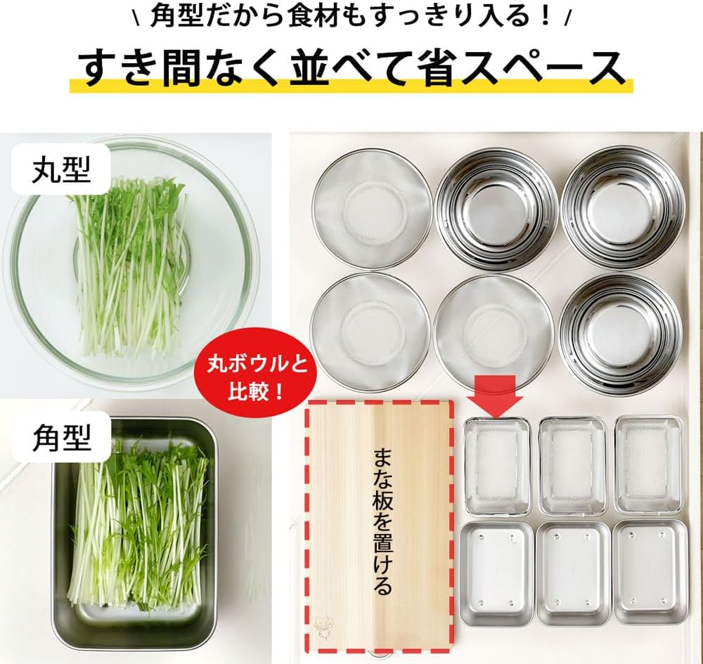 Can be arranged without any gap compared to round bowls Stackable alternately to save space Convenient for dividing cut ingredients Use the bat and colander set to remove shells and drains tofu Lid cannot be sealed