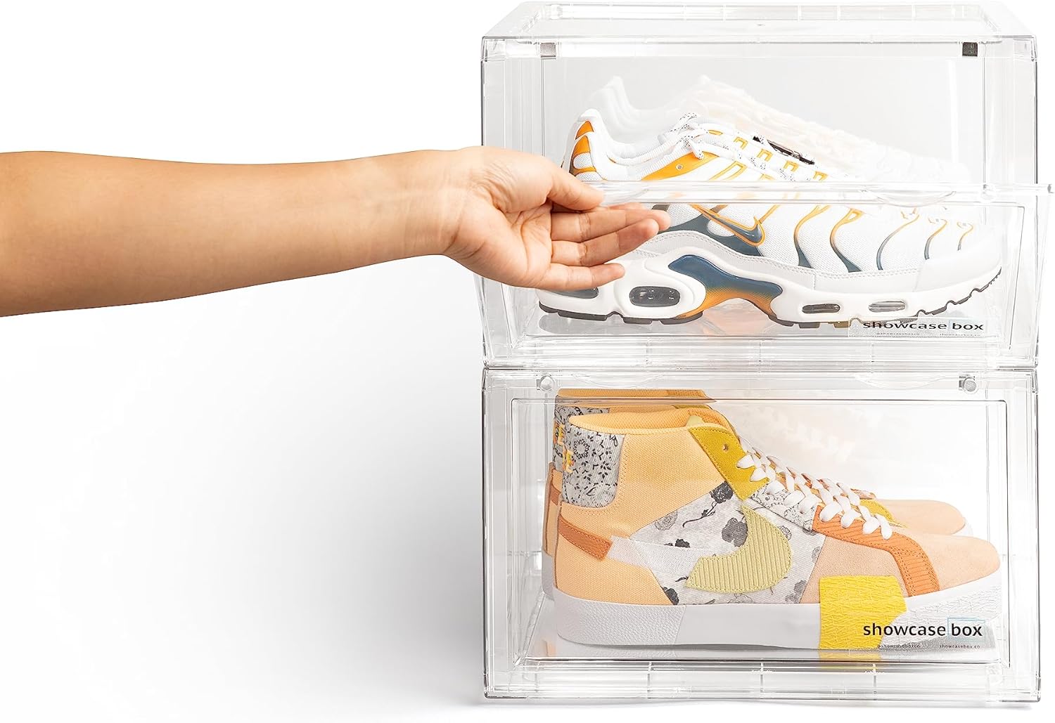 Modern shoe storage is here! Store and protect your sneakers in style with our Premium Showcase Box. Closest thing to acrylic or glass you are going to get! Organize your Collection: Our stackable shoe storage boxes are perfect for reducing clutter and maximizing storage. With their snap-tight magnetic clasping mechanism, you can create a shoe tower, or sneaker wall and elevate your shoe organization game. Thanks to the transparent front door, you can easily locate the right pair of shoes in an instant. A Clutter-Free Solution: Harness the organizational power of multiple clear shoe boxes to keep your closet, hallway, and bedroom tidy. Beyond shoes, these versatile storage bins are ideal for sorting and storing small everyday items – find what you need without having to open the box. They can also store items like scarves, cosmetics, funko pops, books, and toys, making them an all-round solution for decluttering your home. Store Any Shoe: Each storage box measures 14.25''L × 11"W × 8.5''H inches and can accommodate a wide range of shoes up to US size 13, EU 46. From heels and flats to sneakers and flip flops, every shoe type has a home in these boxes. Clean & Fresh Look: Unlike competitor boxes, the sticker on front panel is removable if you wish for an unbranded look.Sticker on front panel is removable if you wish for an unbranded look.