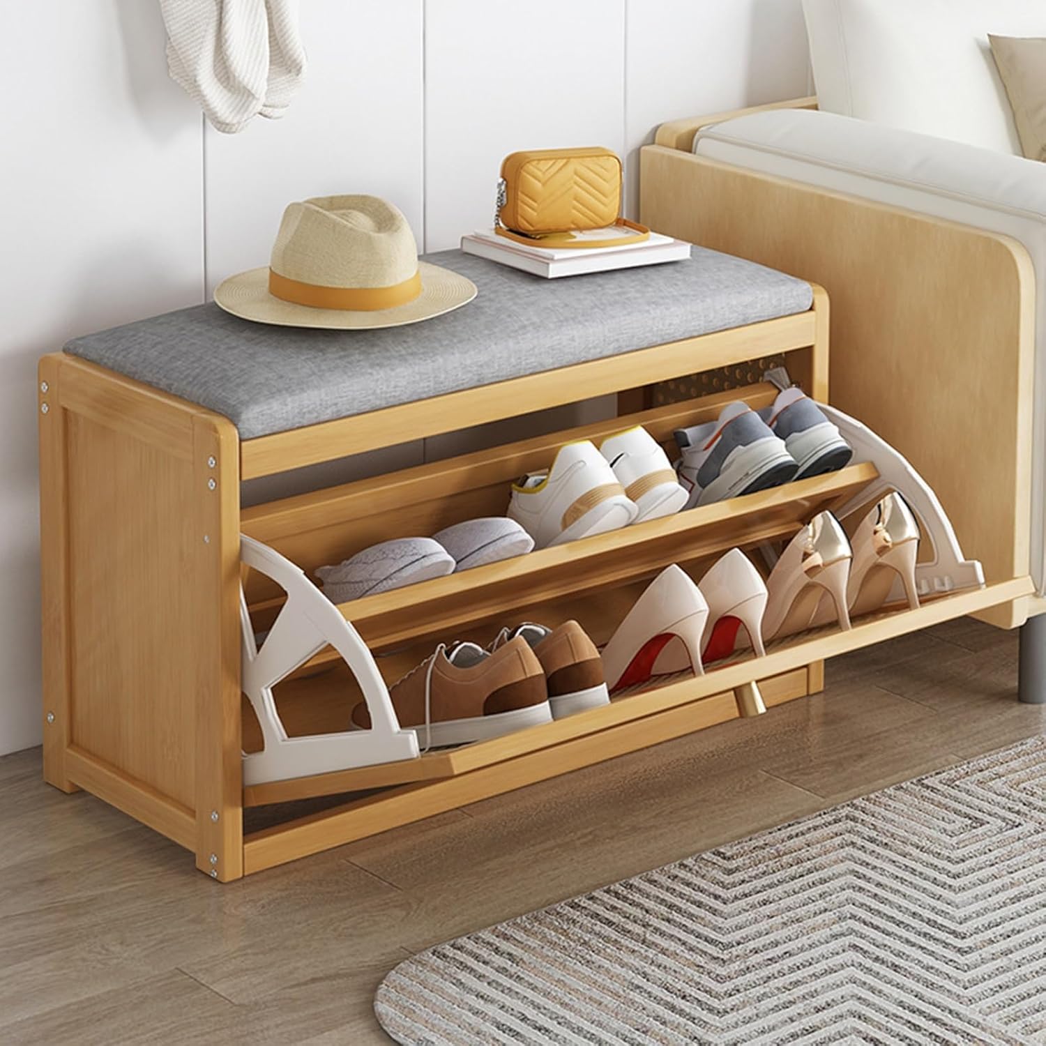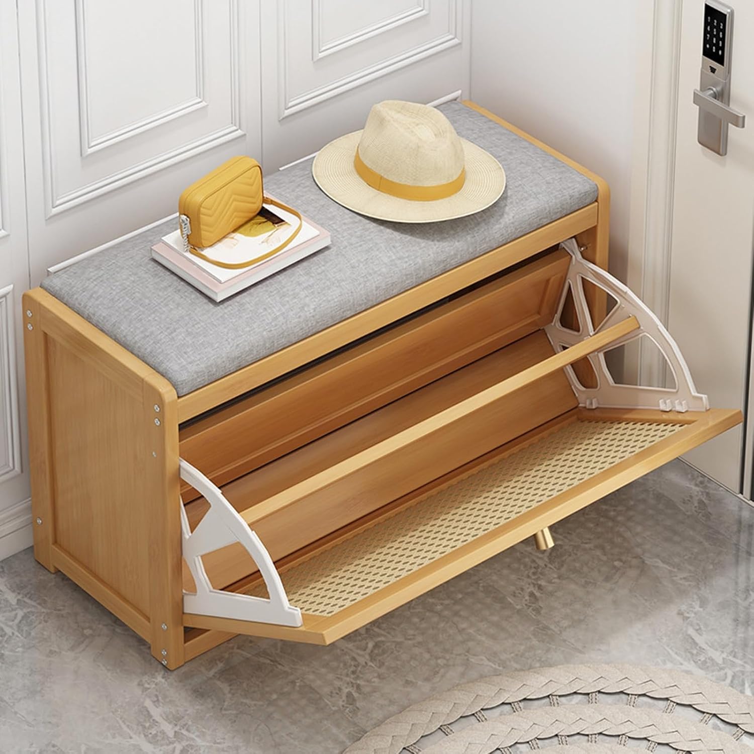 Introducing our versatile entryway bench, expertly crafted frombamboo rattan, designed to enhance your home with both functionality and style. This shoe bench is not only sturdy, boasting impressive load-bearing capacity, but also resistant to tipping and deformation, ensuring long-lasting use. Experience ultimate comfort with the soft sponge seat cushion, elegantly covered in linen fabric. This thoughtful design makes it easy to sit and put on or take off your shoes, enhancing your daily routine. With its two-tier storage solution, this shoe bench efficiently accommodates your everyday footwear, keeping your entryway tidy and nized. The innovative detachable middle shelf allows you to customize the space according to your shoe storage needs, making it suitable for various shoe sizes and styles. Acting as both a stool and a compact shoe cabinet, it solves common shoe storage dilemmas while providing a pleasant shoe-changing experience. The stylish mesh woven pattern adds an elegant touch, seamlessly blending with diverse home decor styles. Whether in your bedroom, living room, study, lounge, balcony, dormitory, or apartment, this shoe rack bench serves as an ideal domestic storage option. Specifins: - Product Name: Shoe Bench with Storage - Material: Bamboo Rattan, Linen, High Resilience Sponge - Size: 19.68x9.84x17.71in, 27.55x9.84x17.71in Packing List: - 1 x Shoe Bench Entryway Please Note: - Allow a size variation of 0-3 cm due to manual measurement. - Color variations may occur due to differences in lighting and screen settings. Thank you for your understanding. Transform your entryway with our stylish and practical shoe bench, making shoe storage and changing a breeze!