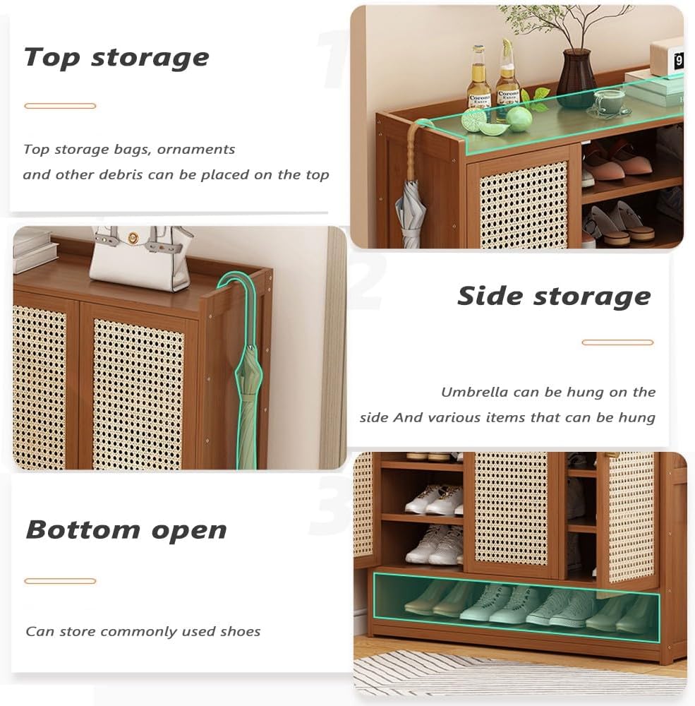 Transform your space with our stylish Rattan-Look Plastic Shoe Cabinet, designed to blend seamlessly into any modern home. Mimicking the natural appearance of rattan, this cabinet adds a warm and inviting touch to your entryway or closet. Why choose our shoe cabinet? 1. **Ample Storage**: Featuring a 7-tier design, available in 90 cm and 120 cm options, it provides generous space for nizing your footwear collection, making it perfect for families or shoe enthusiasts. 2. **Durability**: Crafted to withstand daily use, our shoe cabinet boasts excellent corrosion resistance, ensuring it remains in great condition for years to come. 3. **Dust-Proof and Breathable**: Equipped with grid doors, our cabinet effectively keeps dust and dirt at bay while allowing air circulation, reducing odors and maintaining the freshness of your shoes. **Product Details**: - **Function**: Storage - **Style**: Modern Minimalism - **Materials**: Bamboo board, density board, ABS board - **Dimensions**: 90x32x107 cm, 120x32x107 cm - **Colors**: Natural wood finish, black **Package Contents**: Shoe cabinet x 1, installation tools x 1, dust-proof shoe bags x 5 Create a clutter-free environment while enhancing the aesthetic appeal of your home. Our shoe cabinet not only serves a practical purpose but also elevates your interior decor. **Safety Notice**: Please read the installation instructions carefully before assembly. Use appropriate tools and follow the guidelines for a safe setup. Keep the cabinet out of reach of children and pets until fully assembled. Thank you for considering our shoe cabinet. We wish you a pleasant shopping experience!
