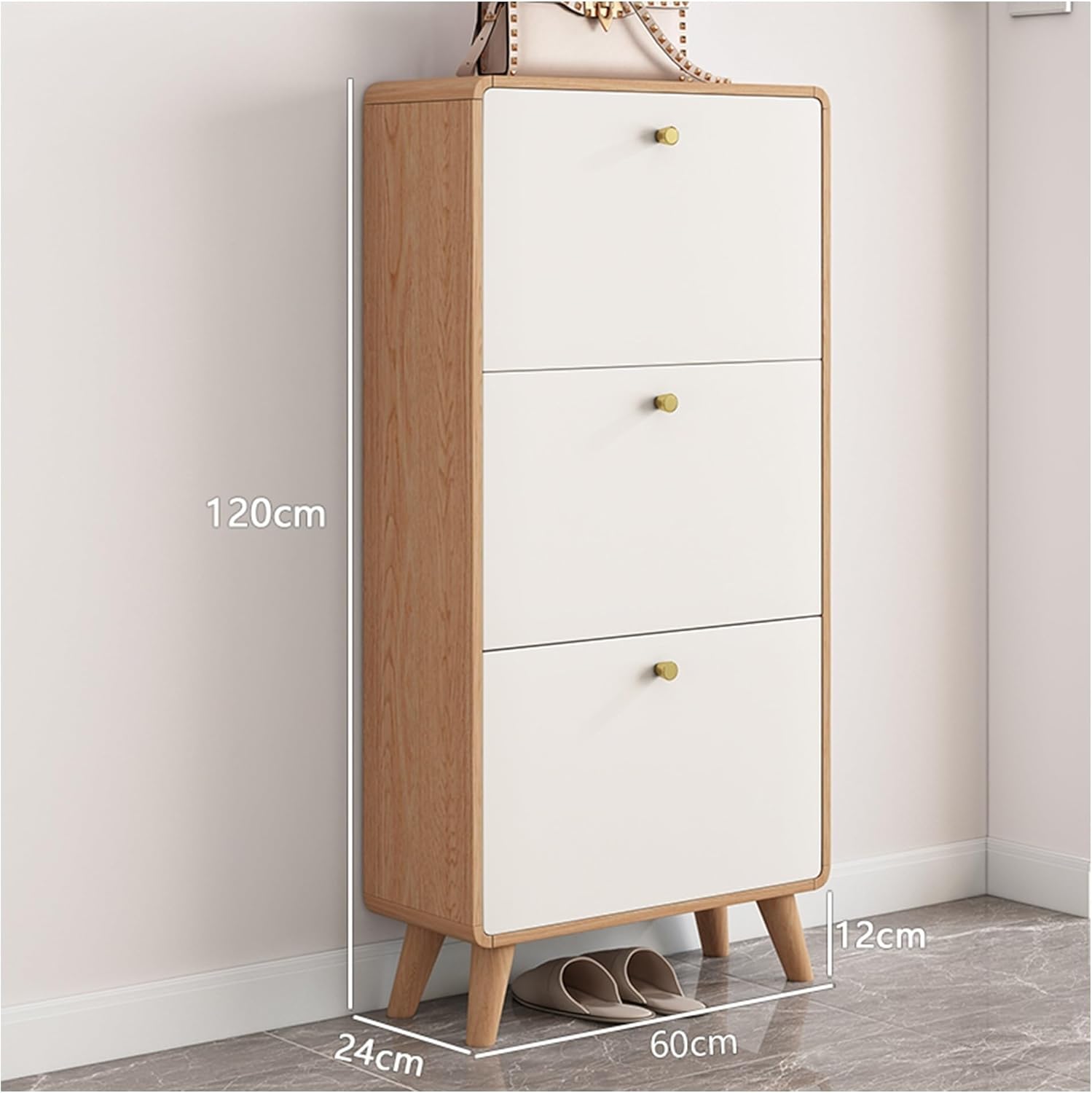 Introducing our stylish Flip Drawer Shoe Cabinet, designed to enhance your home nization while adding a touch of elegance to your space. This versatile shoe storage solution is perfect for any room, whether it’s your entrance hall, living room, study, or bedroom. With its space-saving design, the cabinet occupies a small footprint, making it ideal for compact areas without sacrificing style or functionality. Crafted from high-quality multi-layer solid wood and high-density board, this cabinet not only looks sophisticated but is built to last. The fashionable appearance seamlessly blends with various home decor styles, making it a perfect addition to your interior. The reserved skirting board ensures a polished look, allowing the cabinet to align beautifully with your wall. Safety is a priority, and the rounded corner design helps prevent accidental bumps, making it a family-friendly option. The adjustable dividers provide flexibility, allowing you to customize the interior space according to your shoe collection, whether you have flats, heels, or boots. Assembly is straightforward, so you can enjoy your new shoe cabinet in no time. Embrace the convenience and style of our Flip Drawer Shoe Cabinet and transform your shoe storage experience. Please note that decorations shown in product images are not included. We recommend checking the color and size specifins before purchasing. Due to manual measurement, a slight variation of 3-5 cm may occur. Thank you for understanding, and we look forward to serving you!