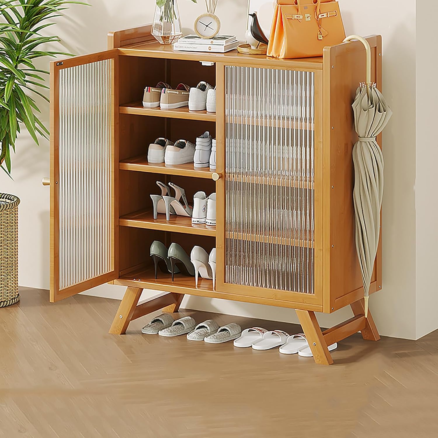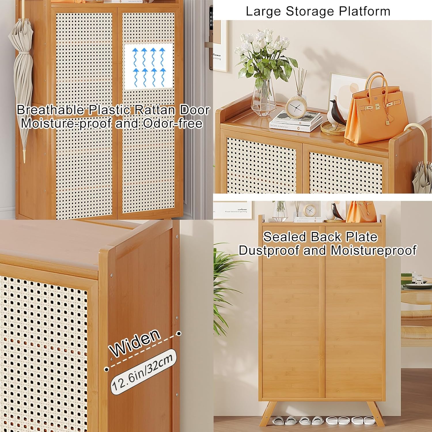 Are you in search of a shoe cabinet that combines space-saving design with ample storage? Look no further than our tall shoe storage cabinet, an ideal solution for your entryway, hallway, utility room, or living room. This cabinet not only offers a stylish natural appearance but is also crafted from high-quality bamboo, making it a perfect addition to any home decor. **Product Features:** - **Spacious Storage:** With a wide countertop and generous interior space, this cabinet can accommodate a variety of shoes, keeping your area organized and clutter-free. - **Breathable Mesh Doors:** The mesh doors provide proper ventilation, helping to keep your footwear fresh and moisture-free. - **Durable Construction:** Equipped with buffer door hinges for smooth operation, this cabinet is designed to last without rusting. - **Smooth Finish:** The finely crafted surfaces protect against everyday bumps and scratches. - **Accommodates Larger Shoes:** At a depth of 12.6 inches, this cabinet can effortlessly fit larger shoe sizes. - **Eco-Friendly Materials:** Made from environmentally friendly bamboo and finished with a high-temperature charcoal-grilled varnish, it is both strong and moisture-resistant. - **Sturdy Design:** The heightened trapezoidal feet enhance load-bearing capacity and effectively prevent shoes from becoming damp. **Specifications:** - **Available Sizes:** - **5 Layers:** 26in (W) x 12.6in (D) x 31.5in (H), holds approximately 16 pairs of shoes. - **7 Layers:** 26in (W) x 12.6in (D) x 43.7in (H), holds approximately 24 pairs of shoes. - **Material:** High-quality bamboo. - **Assembly Required:** Yes. **Package Includes:** - Shoe Cabinet x1 - Pack of Accessories x1 - Instruction Manual x1 Transform your space with our stylish and functional shoe cabinet, and enjoy a tidier, more organized home!