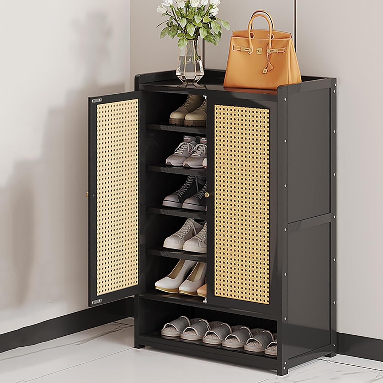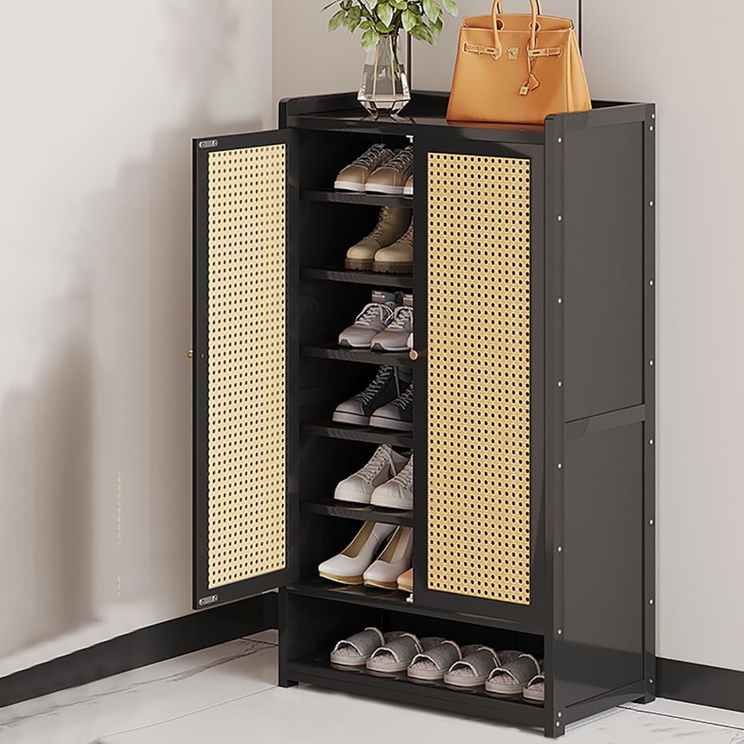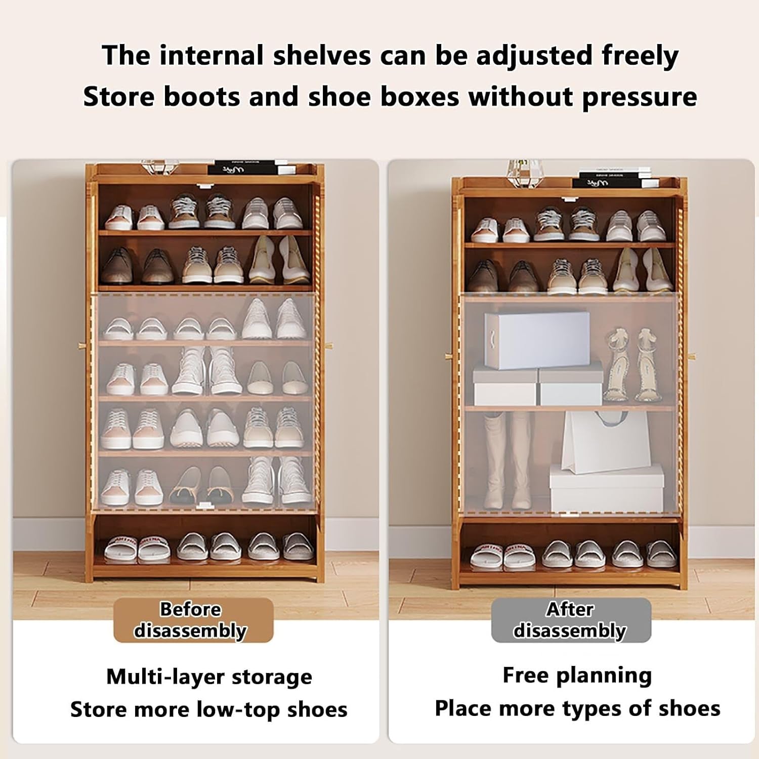 Constructed from natural bamboo, this shoe storage cabinet combines functionality and style, making it an ideal choice for any entryway or closet. Its lightweight design ensures easy mobility while seamlessly fitting into your home decor. The cabinet features a selection of dustproof doors that promote ventilation, helping to prevent moisture and unpleasant odors from building up. The innovative sealed partition design keeps dust out and your items secure. With a raised guardrail on the top plate, you can rest assured that your belongings will stay in place, minimizing the risk of accidents. The open partition at the bottom allows for quick and convenient access to your shoes, making it easy to slip them on or off as you enter or exit. This shoe organizer offers customizable storage with removable layers, accommodating various shoe sizes and providing additional space for bags and other larger items. Whether you're organizing your footwear in the hallway or maximizing closet space, this versatile shoe rack is designed to enhance both function and organization. Product Name: shoe organizer, shoe rack, shoe storage cabinet, shoe rack for entryway, shoe organizer for entryway. Dimensions: - 7 layers: 60/90/120 cm width x 32 cm depth x 94 cm height - 8 layers: 60/90/120 cm width x 32 cm depth x 107 cm height Warm Tips: 1. Please note that slight color variations may occur due to different shooting tools. Refer to the actual product for accuracy. 2. Manual measurements may have an error of 1-3 cm. Thank you for your understanding. Enhance your space with this stylish and practical shoe storage solution today!