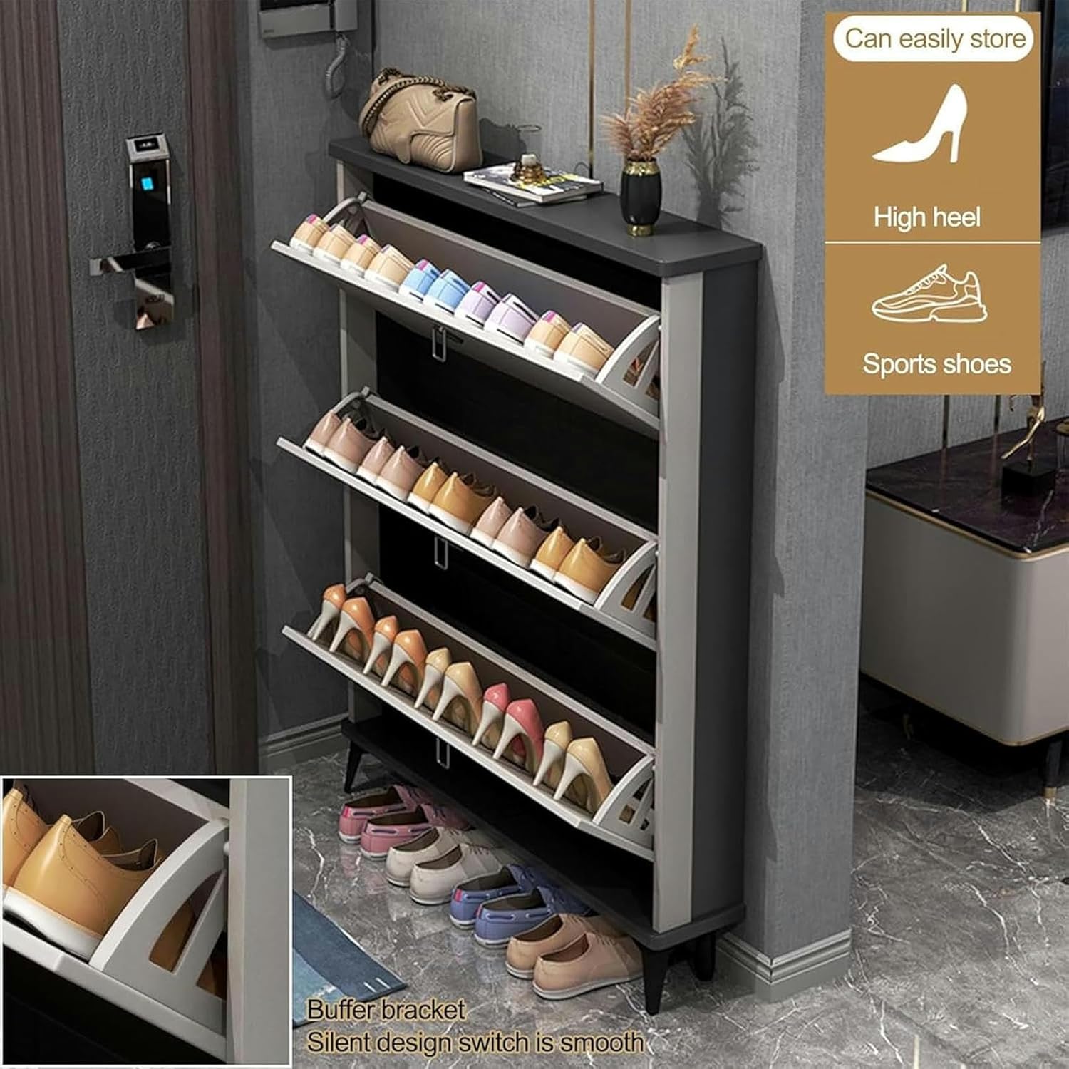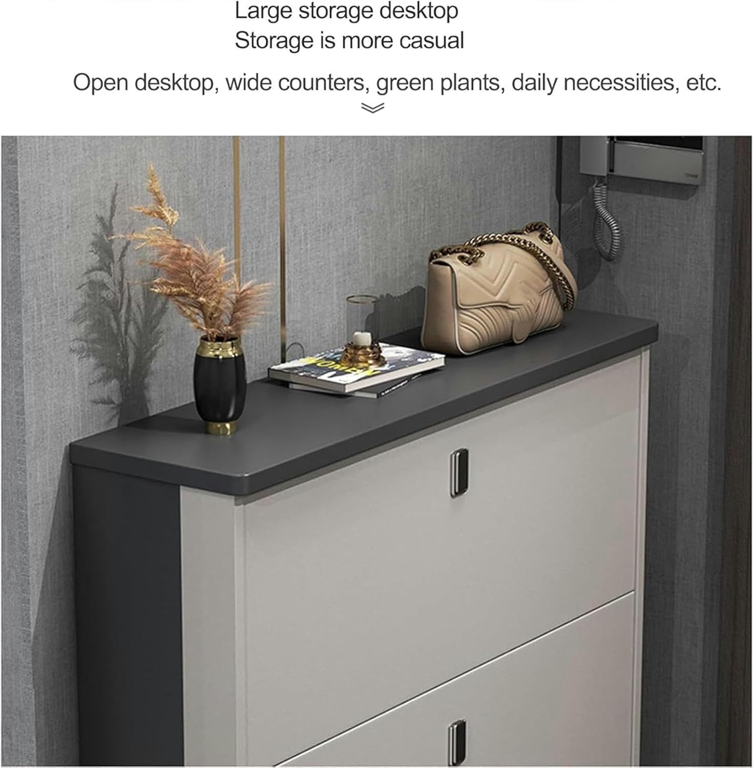 Introducing our stylish and functional flip drawer shoe cabinet, the perfect solution for keeping your entryway organized and clutter-free. Designed with high-quality MDF board, this shoe organizer not only boasts durability but also adds a touch of elegance to your home decor. With its space-saving design and compact footprint, this shoe cabinet fits seamlessly into any room, making it ideal for small apartments or homes with limited space. Its sleek appearance enhances your entryway while providing a practical storage solution for your footwear collection. Equipped with a secured baseboard, the cabinet integrates harmoniously with your walls, creating a cohesive look in your home. The silent hinge mechanism ensures quiet operation, allowing you to effortlessly access your shoes without disturbing the peace of your household. Safety is also a priority with our round corner design, which minimizes the risk of collisions and adds an extra layer of protection for your family. Whether you're storing everyday sneakers or your favorite heels, this shoe organizer is designed to accommodate various shoe sizes and styles. Product Information: - Name: Shoe Cabinet for Entryway / Flip Down Shoe Storage Rack / Shoe Organizers and Storage - Material: High-Quality MDF - Width: 17cm, 24cm - Length Options: 50cm, 60cm, 70cm, 80cm, 90cm - Height: 118cm - Included: 1 x Shoe Cabinet, 1 x Assembly Instructions, 1 x Hardware Set Please note that this item requires self-assembly. We recommend checking all components before starting the assembly process to ensure a smooth setup. Elevate your entrance with our functional and stylish shoe cabinet, and enjoy the convenience it brings to your home organization!