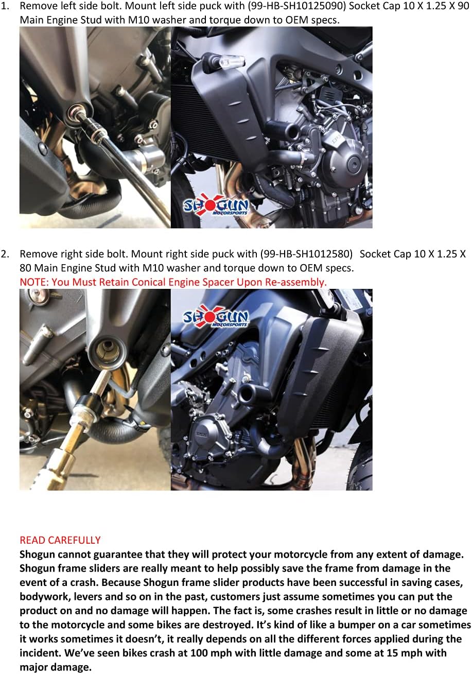 | Included Components | Class 12.9 Zinc Plated Steel Mounting Hardware Kit, Left and Right Shogun Frame Sliders and Matching Swing Arm Spools |