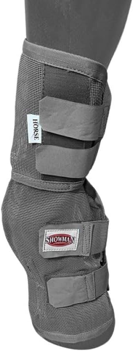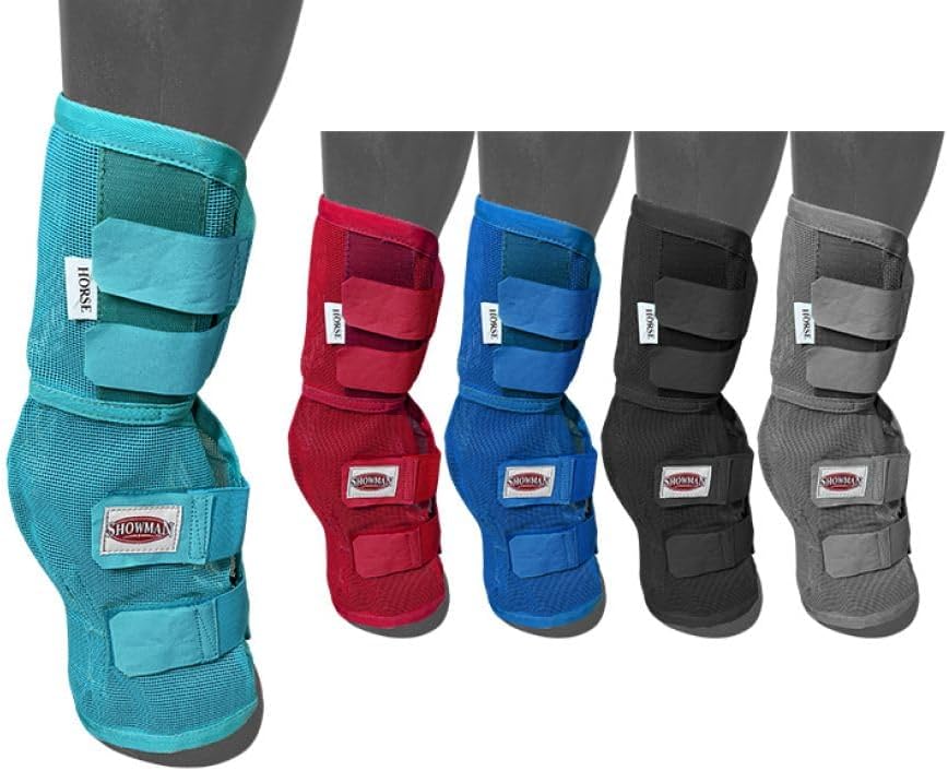 Showman Contoured Mesh Rip Resistant Fly Boots. These boots are made from heavy breathable mesh that will not rip and provides UV protection. The boot's contoured shape allows the boot to form to your horse’s leg reducing bulk and the flexible material allows the boot to move with your horse for greater flexibility. Boots feature velcro closures for easy attachment, fit and security. Sold in set of four (4). Available Sizes: Large, Average, Small/Cob & Pony. Available Colors: Teal, Red, Blue, Black & Gray. **NOTE: Securely fasten the velcro adjustments at and above the fetlock area. This will ensure the boots stay upright and in place all day long.**