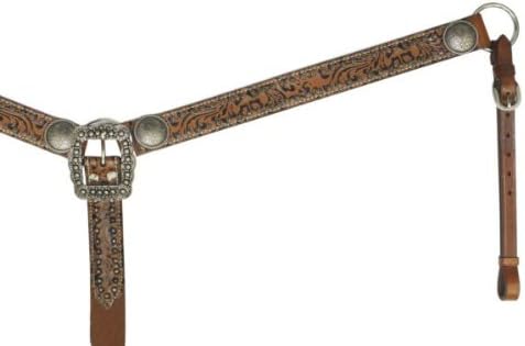 Showman Belt Style Filigree Overlay Breast Collar with Engraved Conchos. This breast collar feature brown filigree print overlay accented with engraved brushed nickle conchos and large belt style buckle in center. 1.5" wide. Straps Measure 16" x 1-1/2" Buckle measures 3" x 2-3/4" wide. Strap will adjust down to 10-1/4" . Filigree print will vary. Matches Headstall #12745