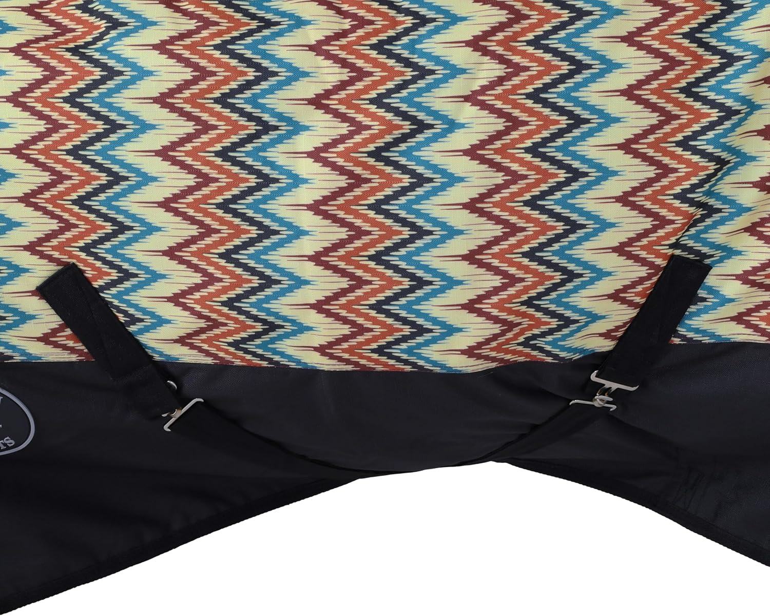 Wrap your horse in comfort and style with the Showman Shockwave 1200D Waterproof and Breathable Turnout Blanket! This vibrant blanket features a fun "shockwave" pattern that’s sure to turn heads, making your horse the star of the paddock. The durable 1200 denier outer shell is designed to withstand the wear and tear of outdoor life, offering reliable protection from harsh weather conditions. You can rest easy knowing your horse is not only protected but also looking fabulous while braving the elements!Designed with your horse's comfort in mind, the blanket boasts a 70 denier ripstop inner shell that is both waterproof and breathable. This innovative design ensures that moisture stays out while allowing sweat to escape, keeping your horse dry and comfortable throughout the day. With a cozy 300-gram polyester filler, this blanket provides excellent insulation, making it perfect for colder weather. Plus, the fleece wither protection prevents rubbing, ensuring your horse enjoys every moment spent in this blanket!But it’s not just about comfort—this blanket is engineered for a perfect fit! The contoured design hugs your horse’s body, providing a sleek look while allowing for freedom of movement, thanks to the shoulder gusset and tail cover. The standard open front with a double buckle closure makes it easy to put on and adjust for a secure fit, while two surcingle belly straps and leg straps ensure it stays in place even during the most playful antics. With adjustable Velcro neck straps, you can customize the fit to provide added warmth and coziness. Get ready for a stylish and functional addition to your horse’s wardrobe with the Showman Shockwave Turnout Blanket—it’s the ultimate combination of flair and practicality!
