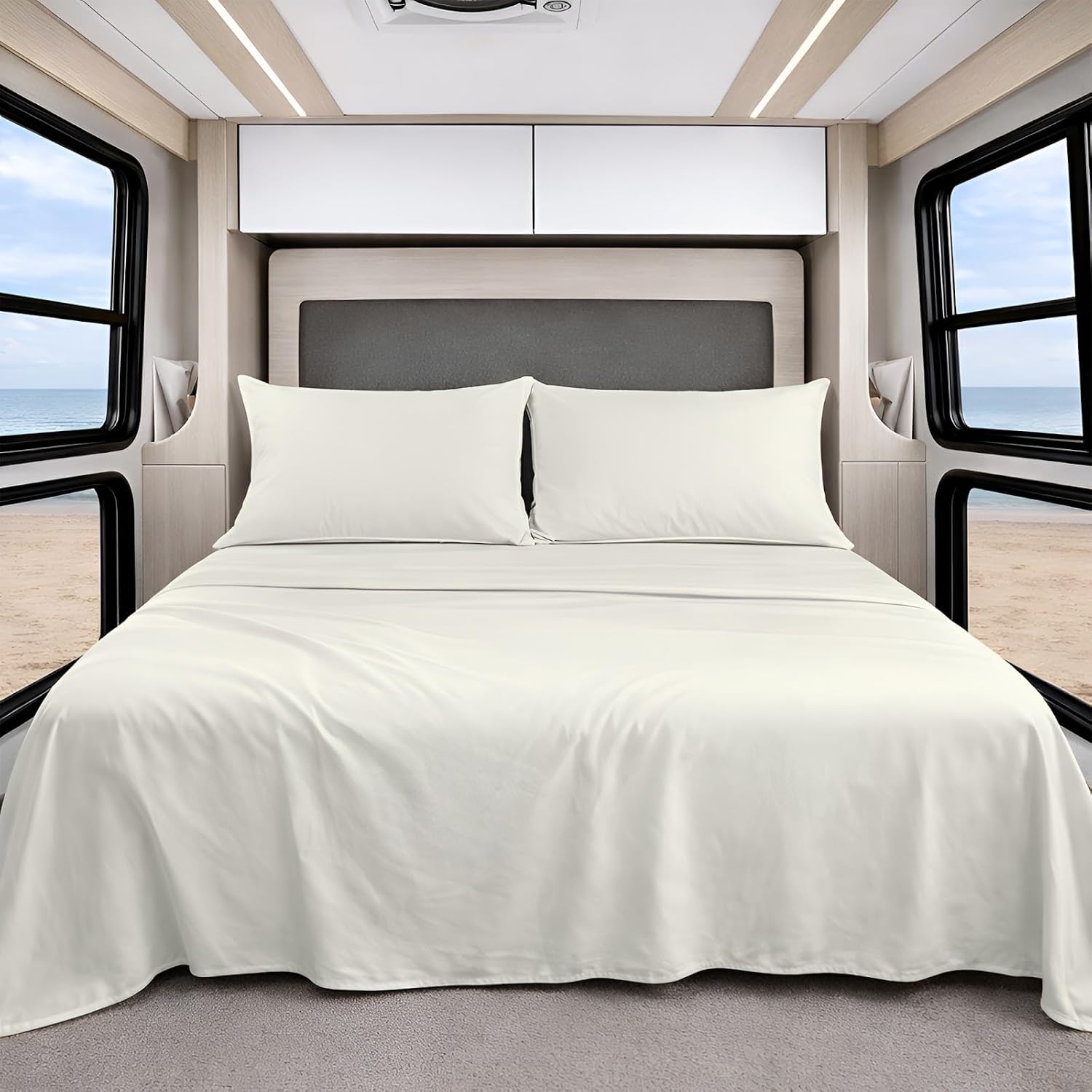 Experience Home-Like Comfort On the Road with Shreem Linen RV Sheet Sets Upgrade your camper, RV, or travel trailer with the cozy luxury of Shreem Linen’s 4 Piece Microfiber RV Sheet Set. Designed specifically for non-standard RV mattress sizes, these sheets combine functionality with premium comfort-so you can rest easy, wherever your journey takes you. Ultra-Soft & Durable Microfiber Made from high-quality brushed microfiber, our sheets are exceptionally soft, breathable, and gentle on sensitive skin. The fabric resists wrinkles, fading, and pilling ensuring long-lasting use trip after trip. Tailored Fit for RV Mattresses Each set includes a deep-pocket fitted sheet that fits mattresses up to 10 inches thick. Whether you're outfitting a bunk, short queen, RV full, or camper king, our sheets are tailored to stay snug and secure without bunching or slipping. Effortless Style & Easy Care Available in a range of solid colors, these sheets add a clean, modern look to your RV interior. They’re machine washable, quick-drying, and require minimal ironing, perfect for life on the go. What’s Included 1 Fitted Sheet (size varies by selection) 1 Flat Sheet 2 Pillowcases Perfect For: RV Owners, Travel Trailers, Campers, Motorhomes, and Tiny Homes looking for a cozy, hotel-like sleep experience on the road.