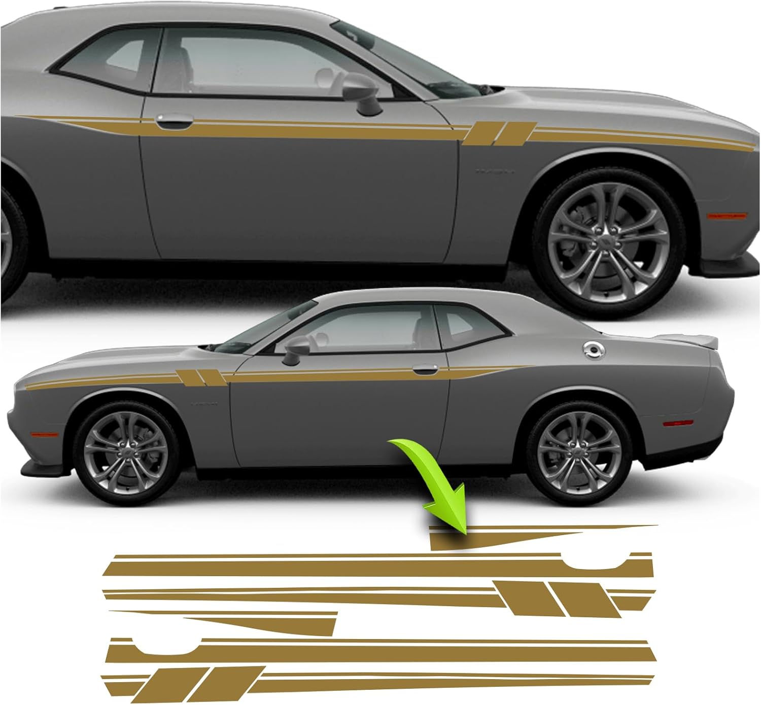 Side Dual Fender Has Mark Racing stripes Compatible With Dodge Challenger T/A Scat Pack RT SSRT8 Hellcat 2008-2023. This Full decal kit is designed to fit 2008-2023 Dodge Challenger SRT8 Daytona and base models. It is a great way to add some style and aggression to your vehicle's hood, while also providing some protection to the scoop from the elements. This decal is made from high-quality vinyl material that is durable and long-lasting. It is easy to install and comes with detailed instructions, as well as a squeegee for smoothing out any air bubbles during installation. The blackout decal has a matte black finish that matches well with the factory black trim on the Charger SRT8 Super Bee Daytona. It is also a perfect complement to other black exterior mods, such as black wheels or blacked-out grilles. Upgrade the look of your Daytona with this sleek and stylish hood scoop blackout decal.