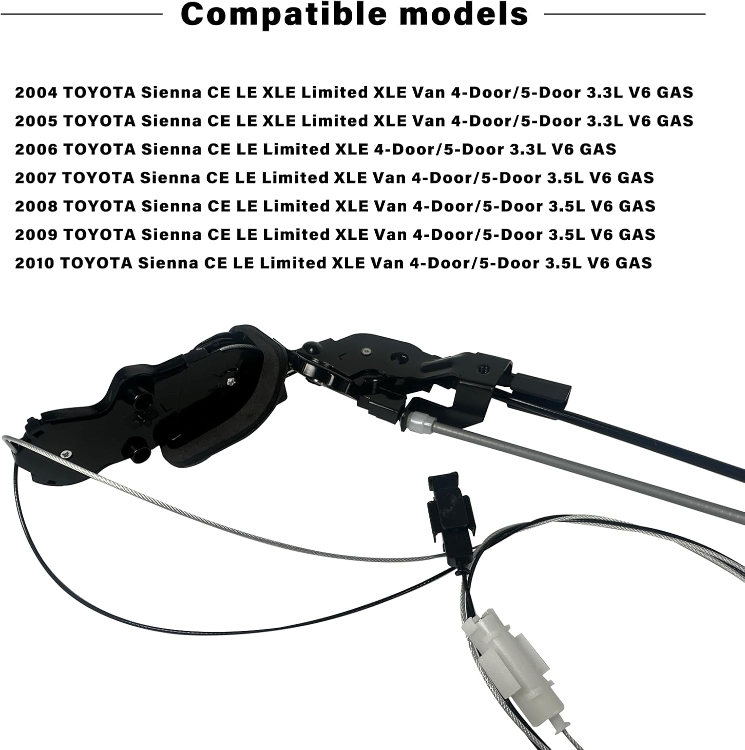 Product Description COMPATIBLE MODELS 2004TOYOTA Sienna CE LE XLE Limited XLE Van 4-Door/5-Door 3.3L V6 GAS 2005TOYOTA Sienna CE LE XLE Limited XLE Van 4-Door/5-Door 3.3L V6 GAS 2006CE LE Limited XLE 4-Door/5-Door 3.3L V6 GAS 2007CE LE Limited XLE Van 4-Door/5-Door 3.5L V6 GAS 2008CE LE Limited XLE Van 4-Door/5-Door 3.5L V6 GAS 2009CE LE Limited XLE Van 4-Door/5-Door 3.5L V6 GAS 2010CE LE Limited XLE Van 4-Door/5-Door 3.5L V6 GAS Item Specifics:Power Sliding Door Cable Kit Product Information:Sienna Left Side Sliding Door Cable Part Name:TOYOTA Sienna Left Sliding Door Cable Brand: UVYMZY Replacement part for OEM:85620-08052 Package Includes:1 * TOYOTA Sienna Left Power Sliding Door Cable Kit Mounting Position:The middle of the inner side of the left sliding door panel Placement on Vehicle:LH Left Driver Side Finish:Smooth Color:Black Warranty:12-Month Note:Please carefully verify your year, make, model in the product details or check your parts pictures, parts No. with ours before purchasing so as to prevent wrong purchasement and unnecessary expenses.