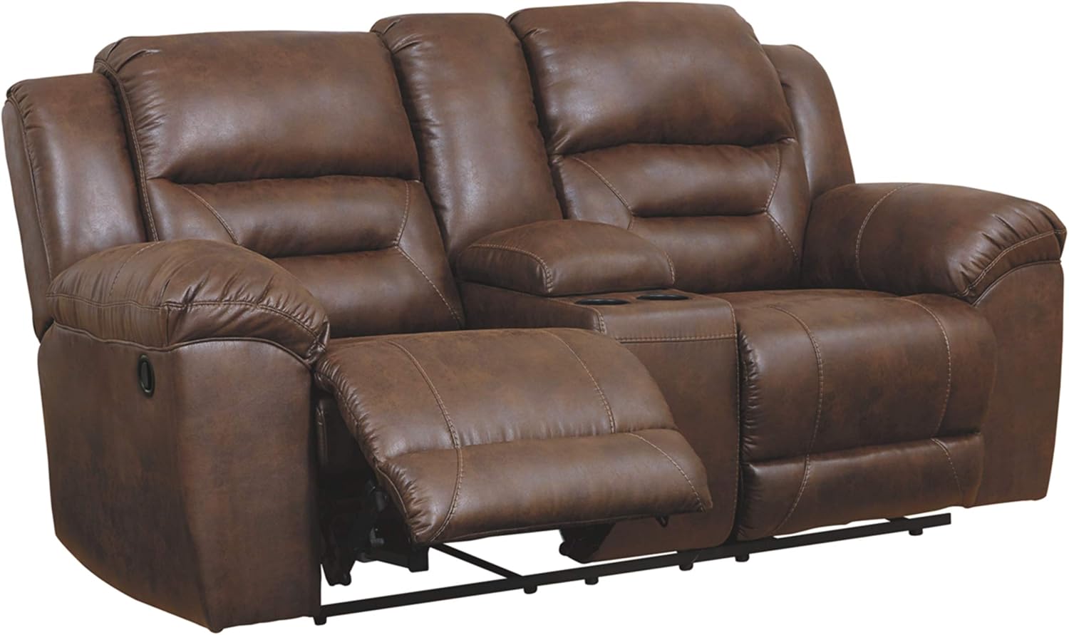The Stoneland Power Rocker Recliner combines the sleek look of leather with the cozy feel of fabric, making it a perfect addition to family spaces or living rooms. Upholstered in high-performance padded faux leather, this recliner is durable and easy to clean, ideal for everyday use. When it’s time to unwind, the one-touch power control lets you adjust to your preferred position effortlessly, while the gentle rocking motion adds soothing comfort. Channel-stitched back cushions provide excellent lumbar support, and attached cushions with foam wrapped in poly fiber ensure lasting comfort. Built with a reinforced frame and metal seat box for stability, this power recliner is designed for both style and durability. Includes power cord; UL Listed.