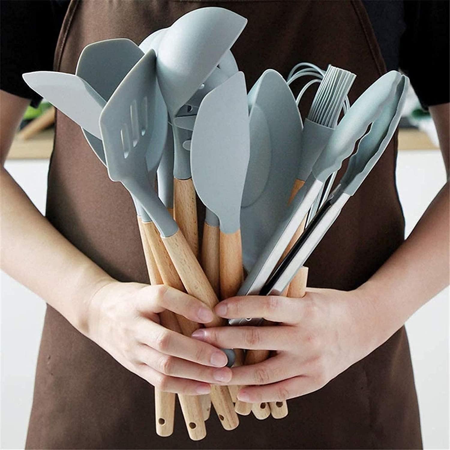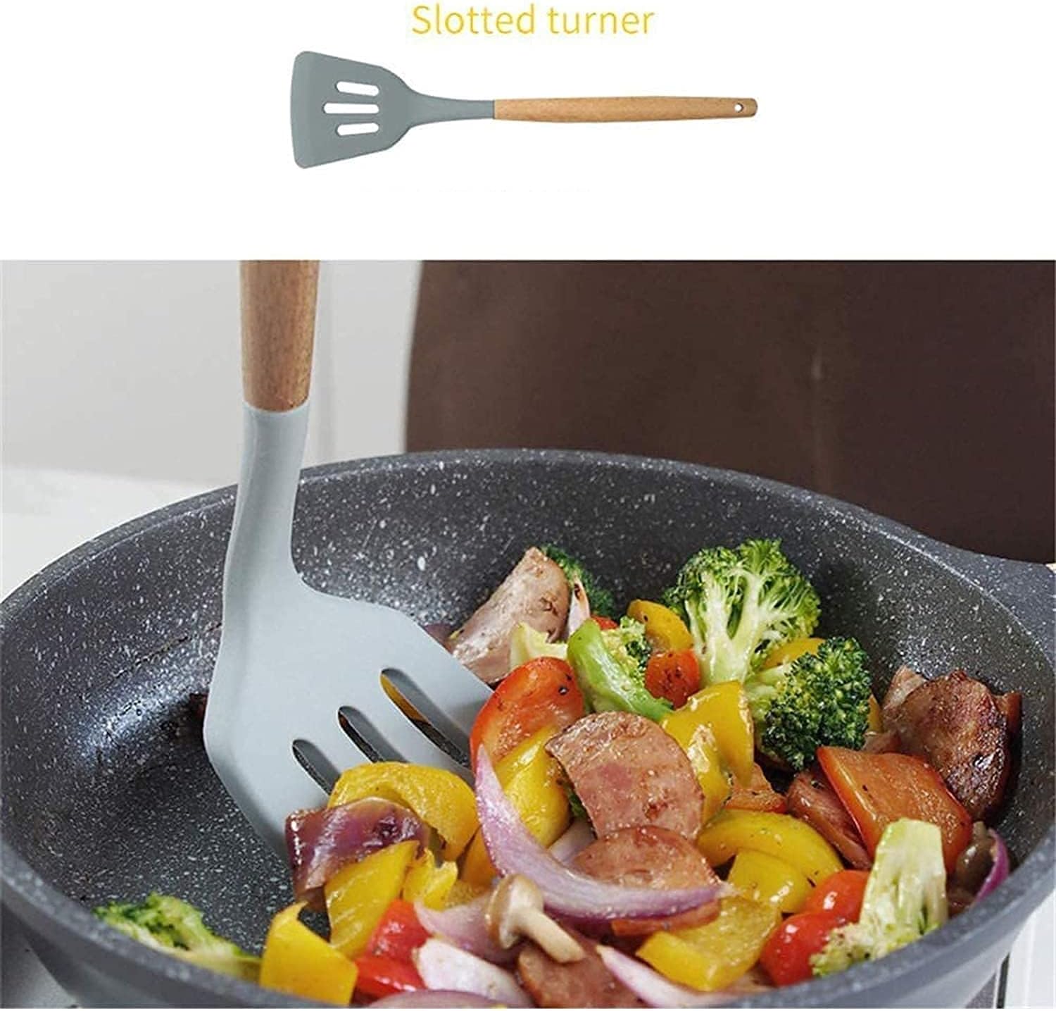 Kitchenware set, made of food contact material with comfortable grip and hanging hole design for easy storage, reassuring material. Kitchenware is easy to clean and helpful in cooking. It is also a skilled stir fryer, easy to pick up food, anti scalding and anti slip, lightweight and easy to use.Cooking utensil sets is a good gift for housewarming, birthday, Christmas, thanksgiving. Perfect for loved ones that like to cook, chefs, or even for your own personal use. If you are cooking enthusiasts, this cooking utensil set will be a good choice.Product name:Cooking Utensil SetsColour: As showMaterial: Wood SiliconeSuitable for: Cooking, Baking and etcWeight: about 960 gFunction: a variety of cooking functions such as frying, frying, fishing, and ShengAvoid prolonged exposure to hot oil, not suitable for ovens, microwave ovens, or direct exposure to open flames.Packing list:1* Cooking Utensil SetsSelling point:Food grade silicone, baby-like careNo deformation, no damage to the pot, easy to clean, no cracking, soft materialNote: Light shooting and different displays may cause the color of the item in the picture a little different from the real thing,Thank you for your understanding. Please allow 1-3% error due to manual measurement.Please make sure you do not mind before you bid.After sales: Our products undergo a rigorous quality inspection, please rest assured to buy,Our products and services will not let you down, If you have any questions, feel free to contact us and we will provide you with the best service. thank you for your support to our store. I wish you and your loved ones good healt