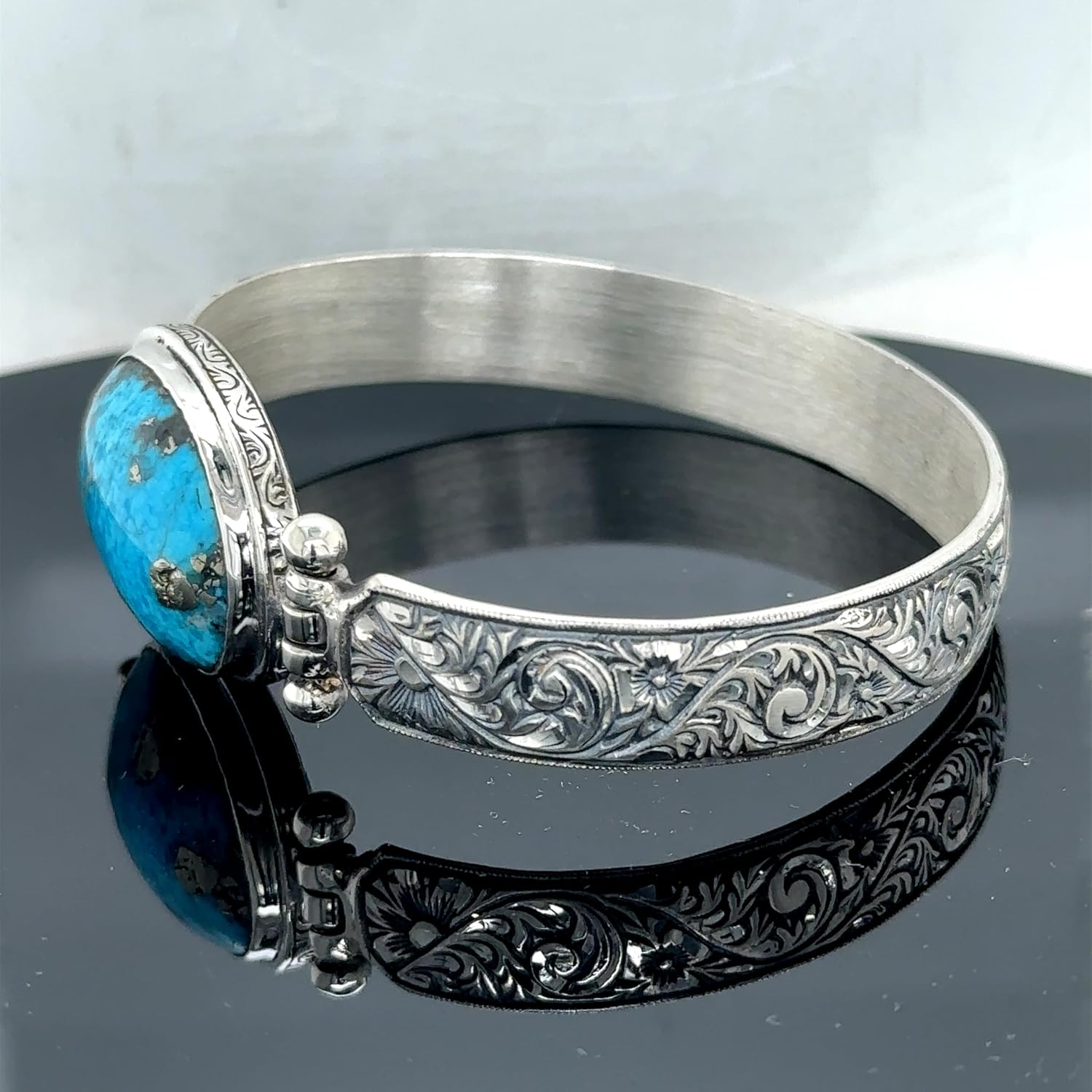Silver Natural Turquoise Stone Bracelet, Men Turquoise Stone Engraved Bracelet, Handmade Men Bracelet, Elevate your style with this stunning silver natural turquoise stone bracelet, handcrafted to perfection. Crafted from 925k sterling silver, this bracelet features exquisite turquoise stones meticulously engraved, adding a touch of elegance and sophistication to your look. The natural beauty of the turquoise stones is accentuated by the gleaming silver, creating a striking contrast that will undoubtedly turn heads. Designed with durability in mind, this bracelet is built to withstand the test of time, making it a treasured accessory for years to come. Whether you're dressing up for a special occasion or simply seeking to add a touch of refinement to your everyday attire, this handmade men's bracelet is a true statement piece. Embrace the timeless allure of turquoise and silver with this exceptional bracelet.