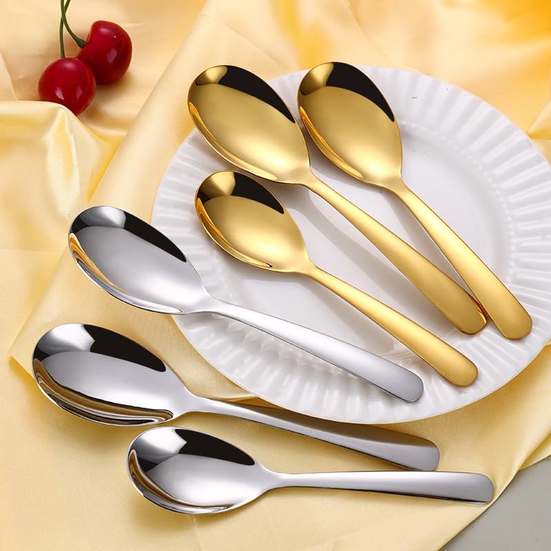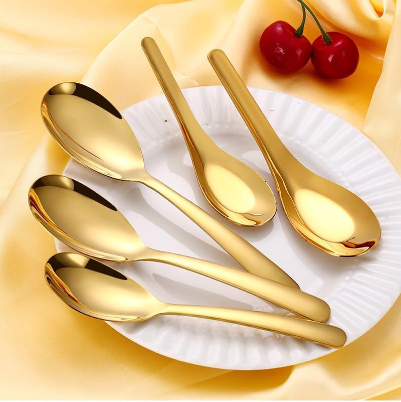 Material: 304 stainless steelApplicable to: AdultsStyle: Light luxurySpecifications: Medium round bottom spoon (silver)Specifications: Medium round bottom spoon (gold)pattern: plainPolishing process: cloth wheel polishing (mirror polishing)Product Category: SpoonProduct quality level: qualified productsStyle type: Light luxury retro.About our BrandOur brand is GOODJAYVEN. We have always been committed to Household items. Do our best to bring more creative products to our customers.