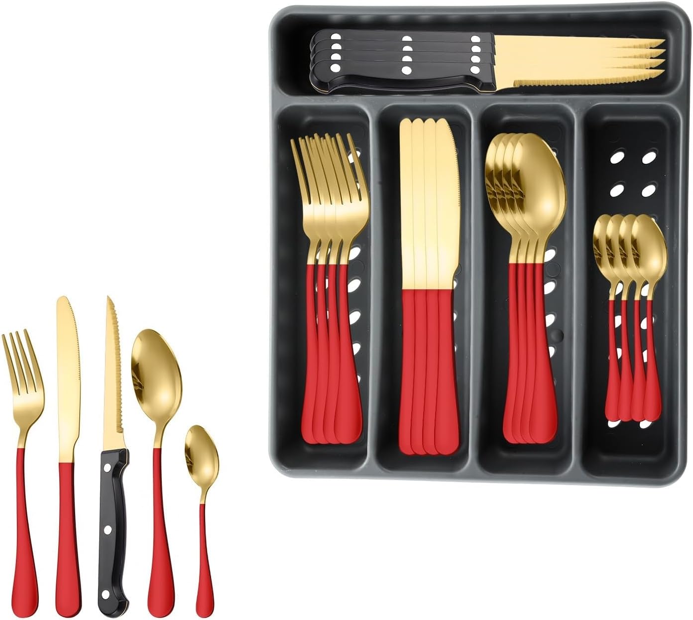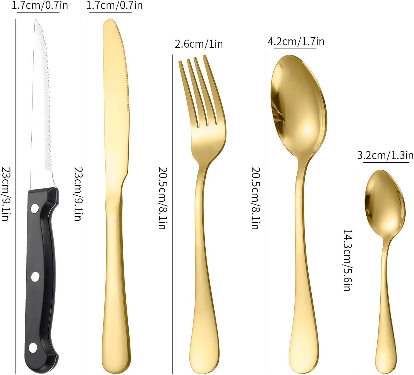 Material: Stainless steelPolishing process: cloth wheel polishing (mirror polishing)Set list: steak knife/dinner knife/dinner spoon/dinner fork/tea spoon*6 color box + drain storage boxStyle: Modern and simpleStainless steel material: 410 stainless steelSpecifications: Silver 20-piece setSpecifications: Gold 20-piece setSpecifications: Rose gold 20-piece setSpecifications: Rainbow color 20-piece setSpecifications: Black 20-piece setSpecifications: Black and gold 20-piece setSpecifications: Green and gold 20-piece setSpecifications: Pink gold 20-piece setSpecifications: Red and gold 20-piece setSpecifications: Blue and gold 20-piece setSpecifications: Platinum 20-piece setProduct quality level: first-classStyle: Modern and simpleColor: Silver/Gold/Rose Gold/Rainbow/BlackStyle type: Simple styleProduct category: Knife, fork and spoon set.About our BrandOur brand is GOODJAYVEN. We have always been committed to Household items. Do our best to bring more creative products to our customers.