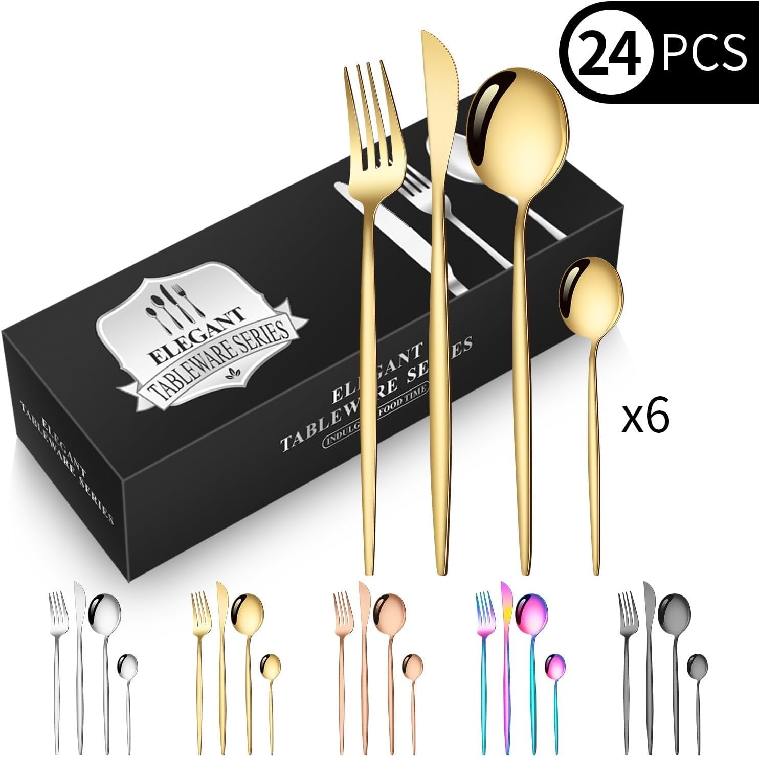 Item No.: Flat PortugalMaterial: Stainless steelPolishing process: cloth wheel polishing (mirror polishing)Set list: Knife*6 Fork*6 Spoon*6 Teaspoon*6Style: Modern and simpleStainless steel material: 410 stainless steelSpecifications: [Silver] 24-piece setSpecifications: [Gold] 24-piece setSpecifications: [Rose Gold] 24-piece setSpecifications: [Rainbow Color] 24-piece setSpecifications: [Black] 24-piece setSpecifications: [Black and gold] 24-piece setSpecifications: [Green Gold] 24-piece setSpecifications: [Pink Gold] 24-piece setSpecifications: [Red and gold] 24-piece setSpecifications: [Blue and gold] 24-piece setSpecifications: [White Gold] 24-piece setProduct quality grade: first-classStyle: Modern and simpleStyle type: Simple styleProduct category: Knife, fork and spoon set.About our BrandOur brand is GOODJAYVEN. We have always been committed to Household items. Do our best to bring more creative products to our customers.