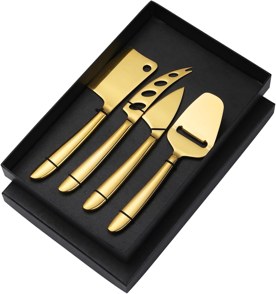Product Category: Knives and ForksMaterial: stainless steelPolishing process: Cloth polishing (mirror polishing)Style: modern simpleStainless steel material: 410 stainless steelColor: Silver cheese knife and spatula 4-piece set (gift box packaging)Color: Golden cheese knife and spatula 4-piece set (gift box packaging)Color: Rose gold cheese knife and spatula 4-piece set (gift box packaging)Color: Fantasy color cheese knife and spatula 4-piece set (gift box packaging)Color: Black cheese knife and spatula 4-piece set (gift box packaging)Product quality level: first-class productStyle type: simple style.About our BrandOur brand is GOODJAYVEN. We have always been committed to Household items. Do our best to bring more creative products to our customers.