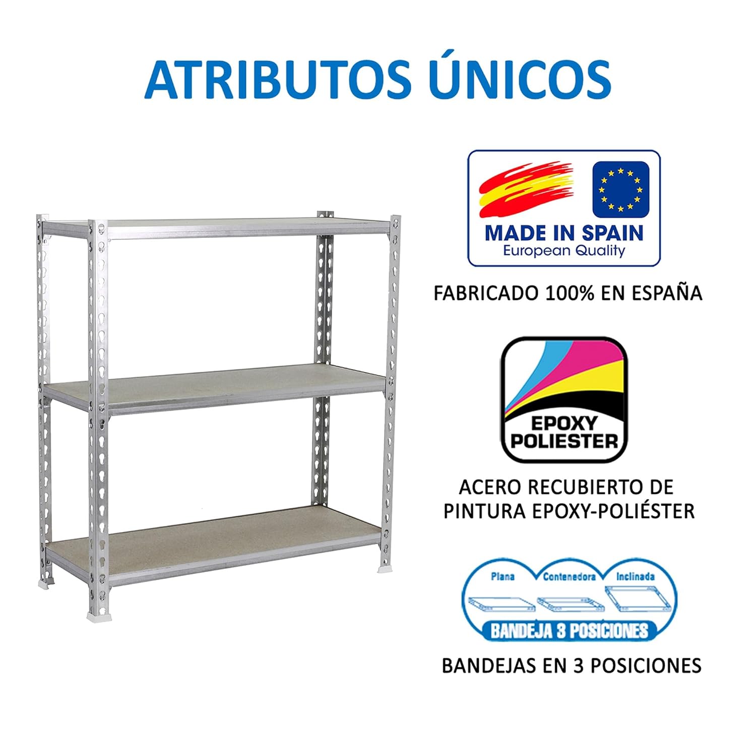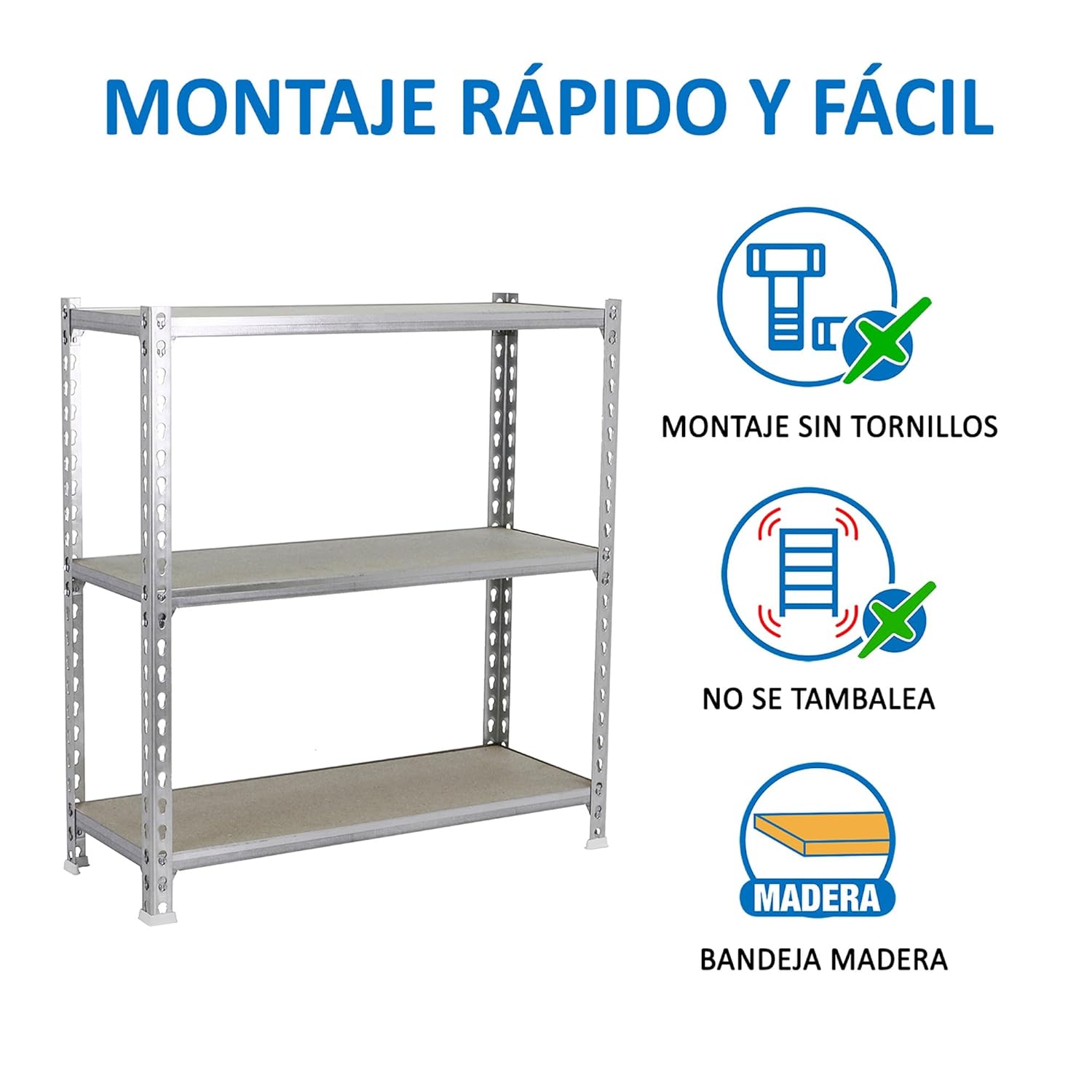 Metal shelf without screws with chipboard, in color WHITE/WOOD. It has 3 shelves. The dimensions of this shelf are: 900x1100x300 mm. And it has a load capacity of 100 kg. It is manufactured in Spain and is assembled quickly following the instructions.