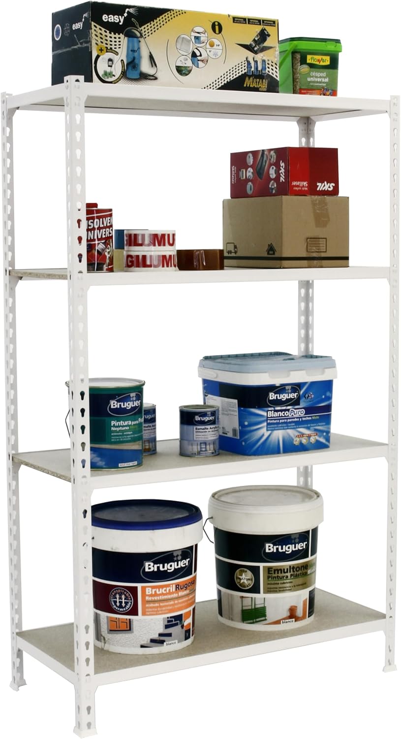 Boltless metal shelving unit with chipboard, white/wood. It has 4 shelves. The dimensions of this shelf are: 1500 x 1000 x 400 mm. And it has a load capacity of 150 kg. It is made in Spain and is quickly assembled following the instructions.
