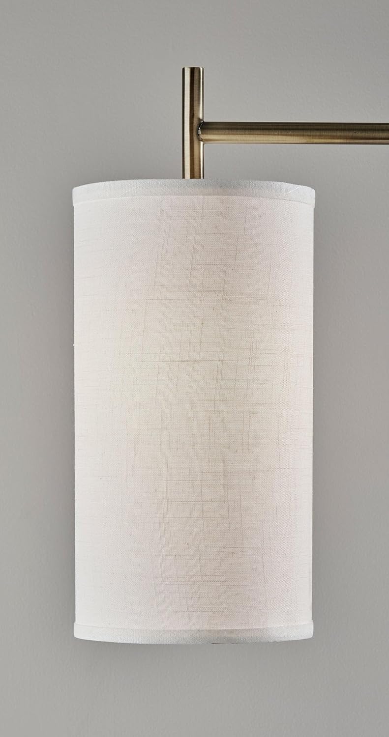 Stylishly illuminate any room with the mid-century modern design elements of the Zion floor lamp. The base and stand feature a monochrome antique brass finish and clean lines and angles. A long slender pole rises from the compact rectangular base and supports a short arm. Suspended from the arm is a tall drum shade made of white textured fabric that softly diffuses the light from a 100W bulb. The floor lamp is also available with a black metal finish and beige textured shade.