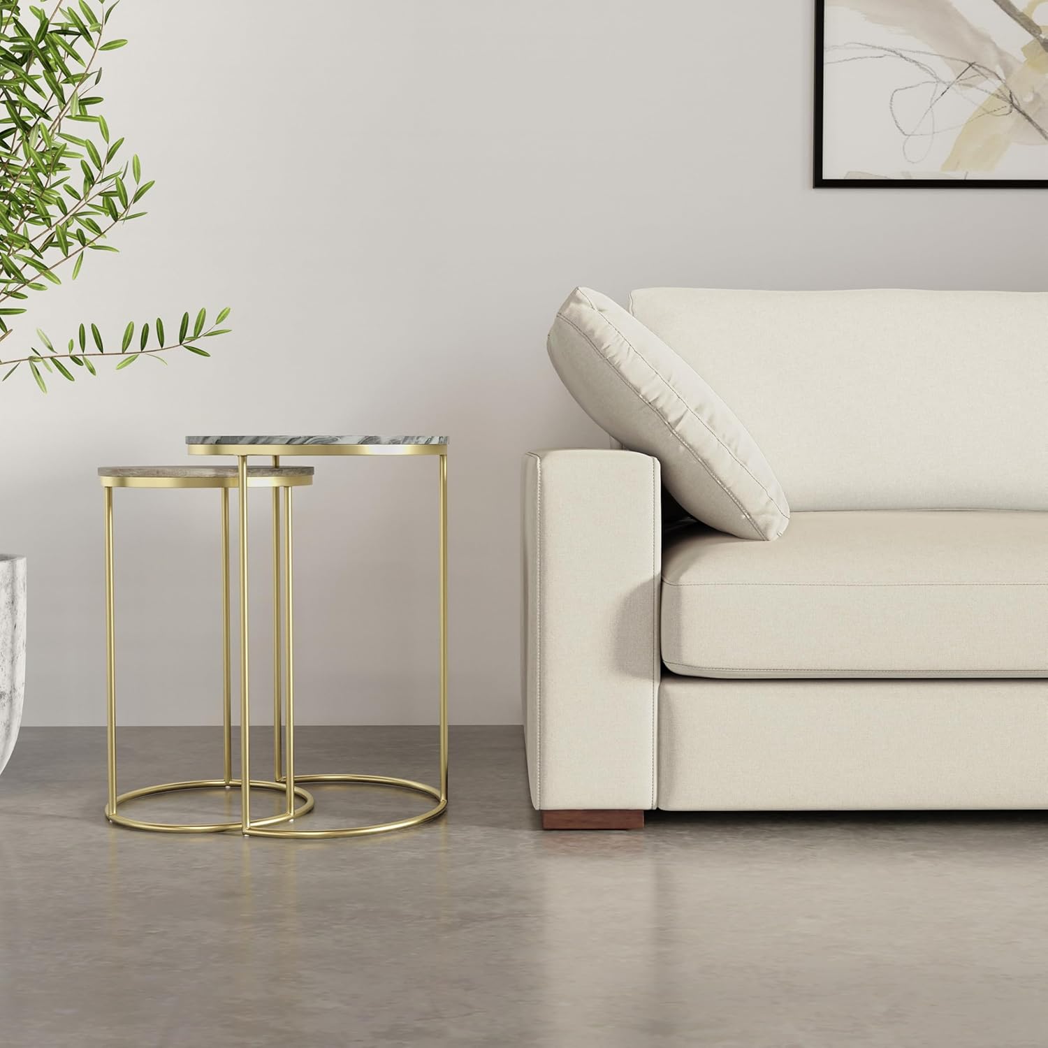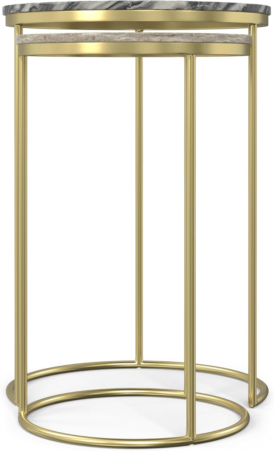 The Ashley 2-Piece Nesting Table Set saves space and maximizes functionality. Lightweight and compact, these round side tables are easy to move around: Nest them together when not in use and separate them when you need more surface space. The larger table features a Grey Marble tabletop, while the smaller table features a contrasting Natural Marble tabletop. Both tables have elegant, Gold-finish Metal bases that add shine to a room.